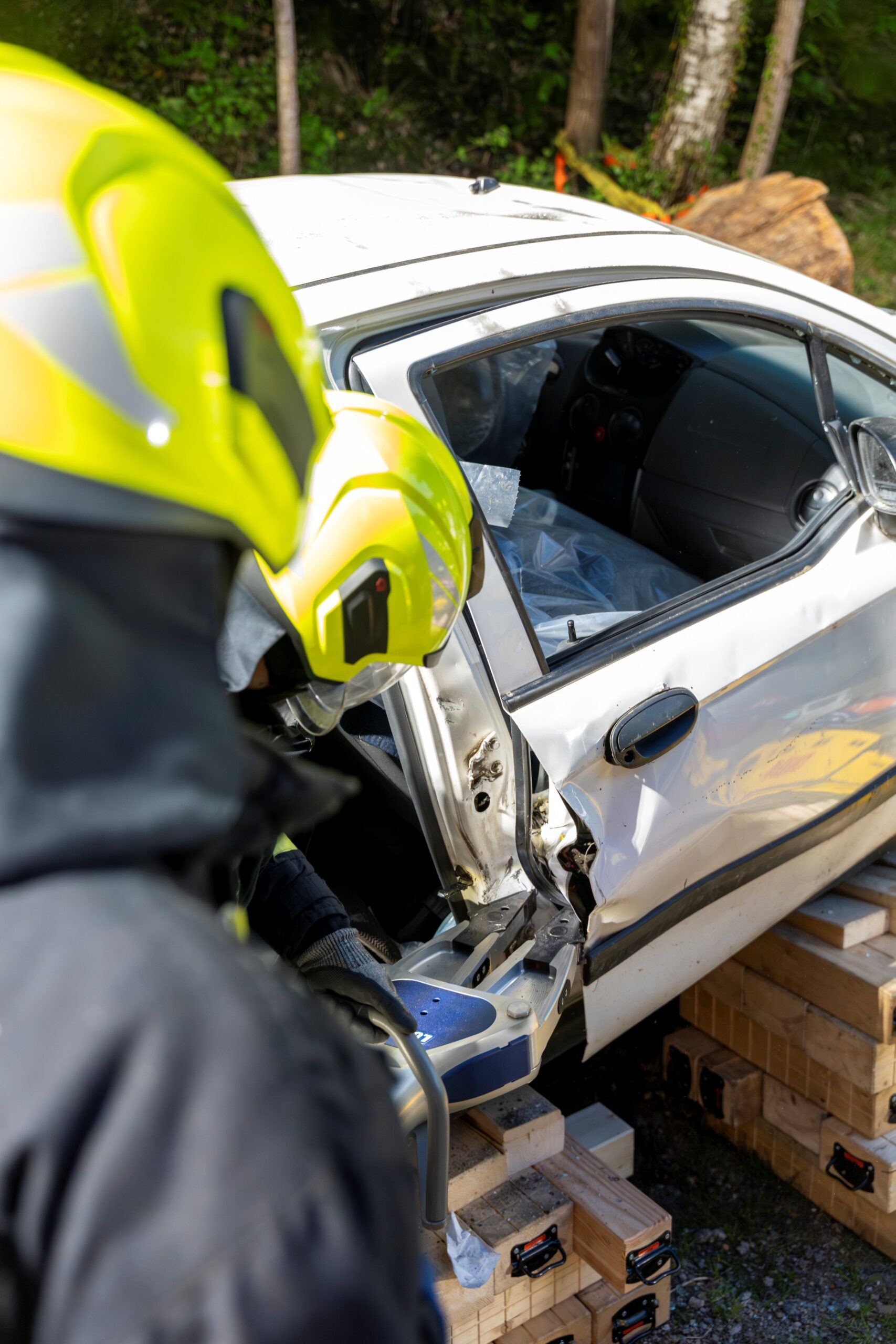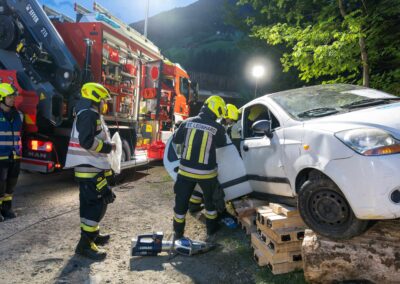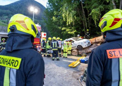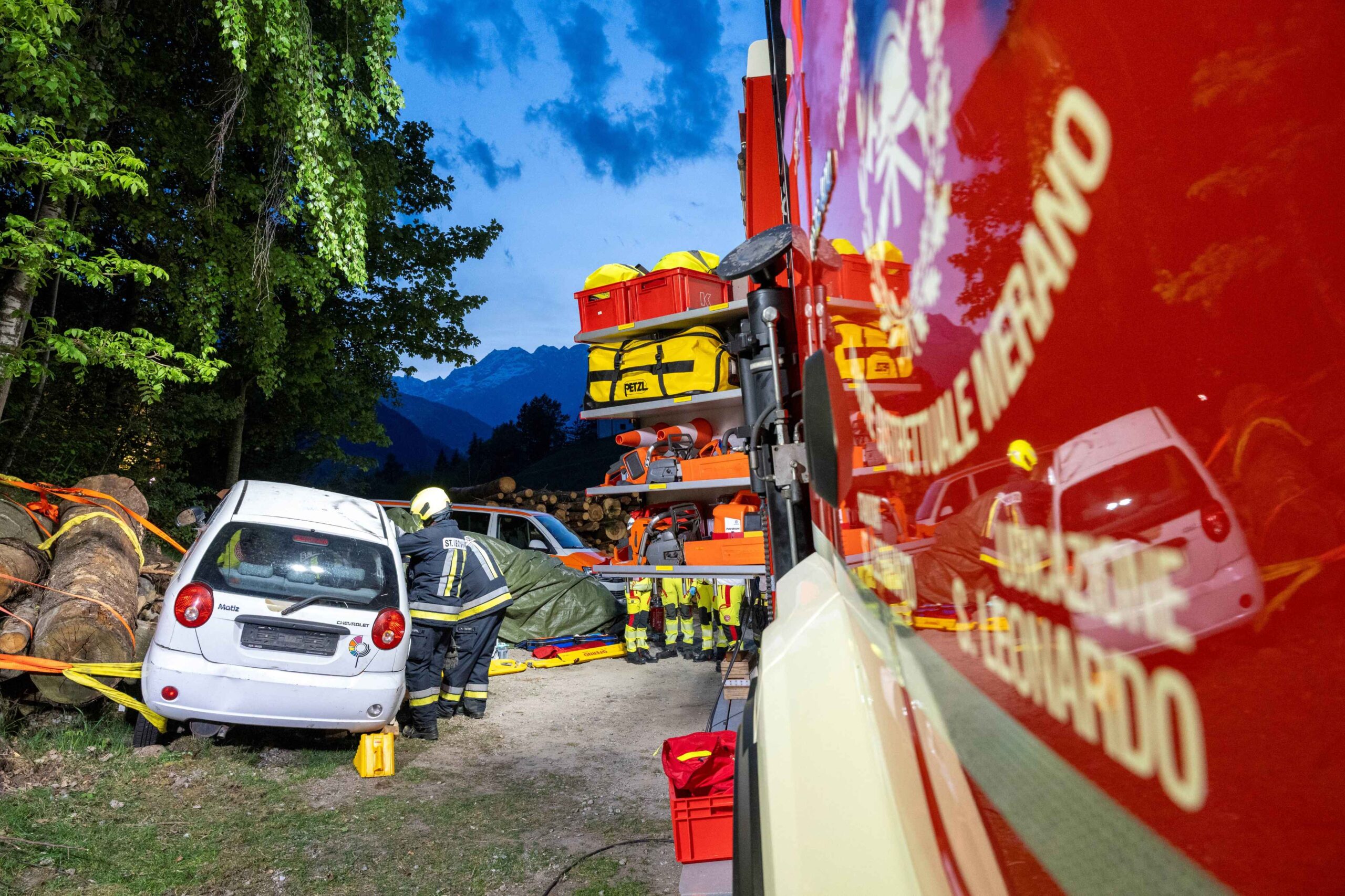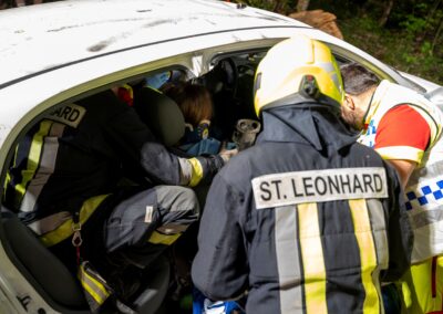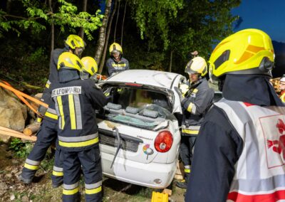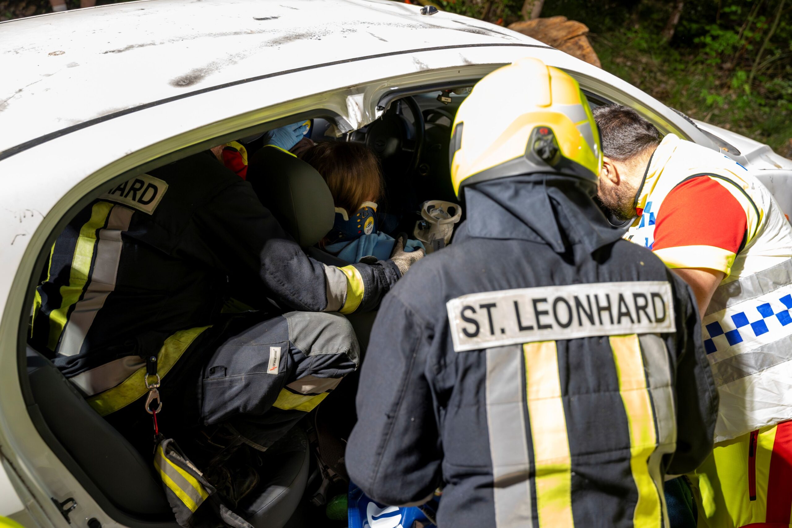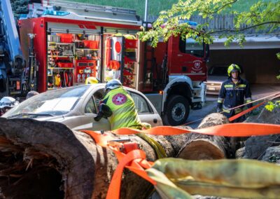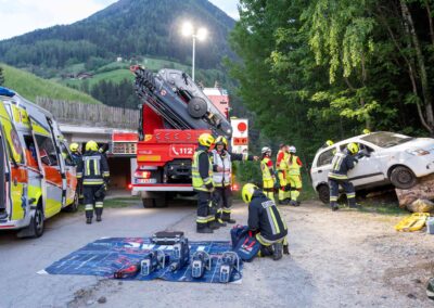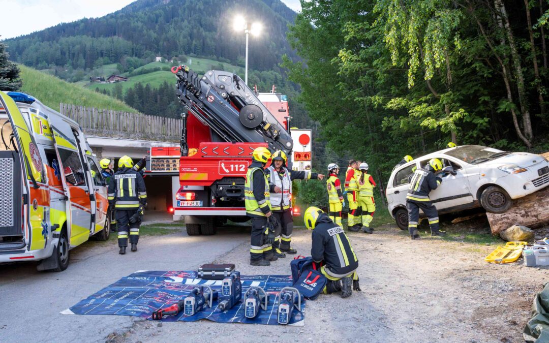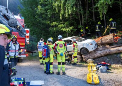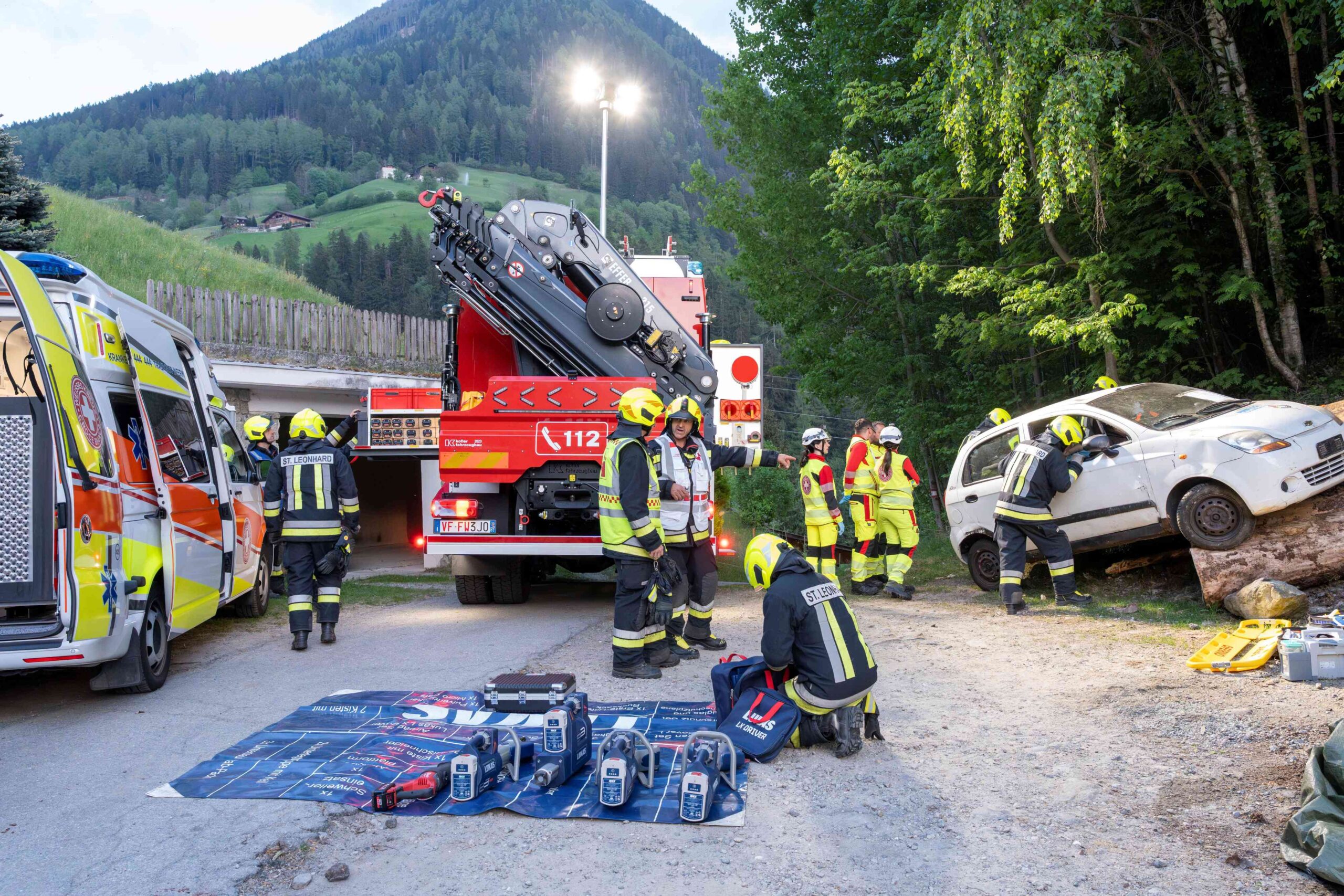Angenommen wurde ein Verkehrsunfall mit eingeschlossenen und verletzten Personen. Da das Fahrzeug auf einen Baumstamm aufgefahren war und ein weiterer abzurollen drohte, galt es zunächst, das Fahrzeug zu sichern. Nach erfolgter Freigabe nahmen die Helfer*innen des WK-Passeier die Erstversorgung vor. Die Beifahrerin konnte durch die Schaffung einer großen Seitenöffnung schonend geborgen werden.