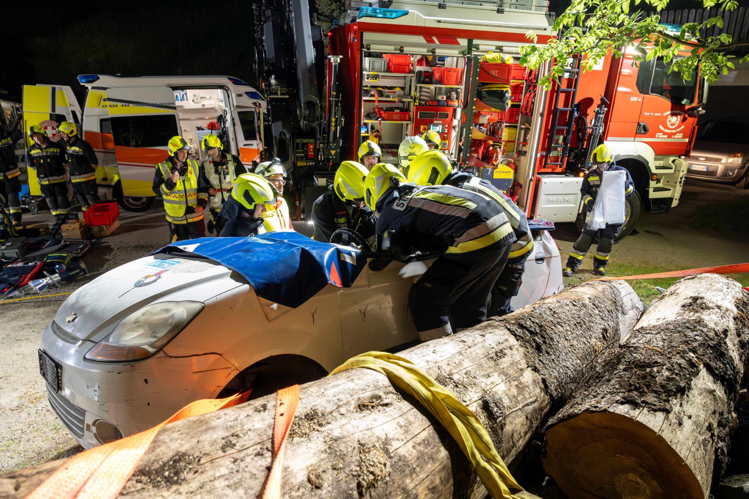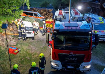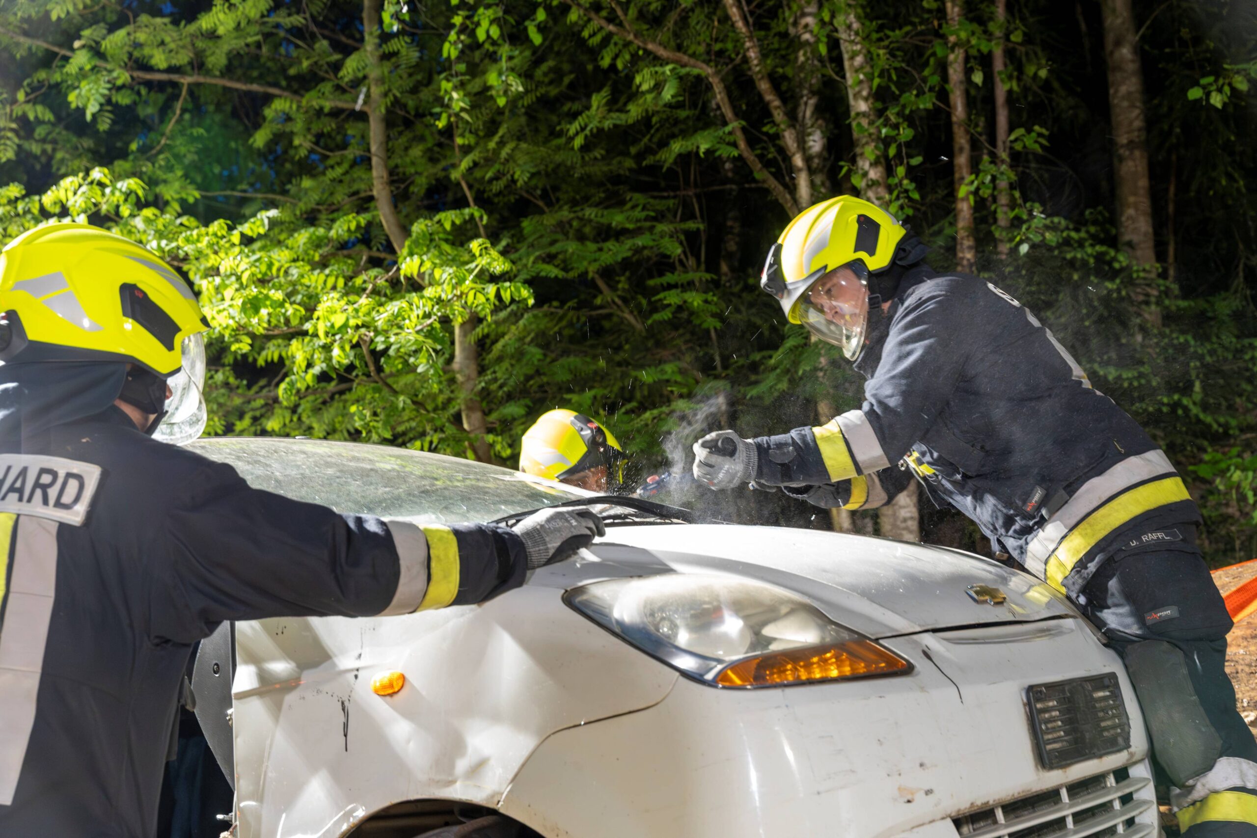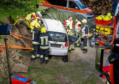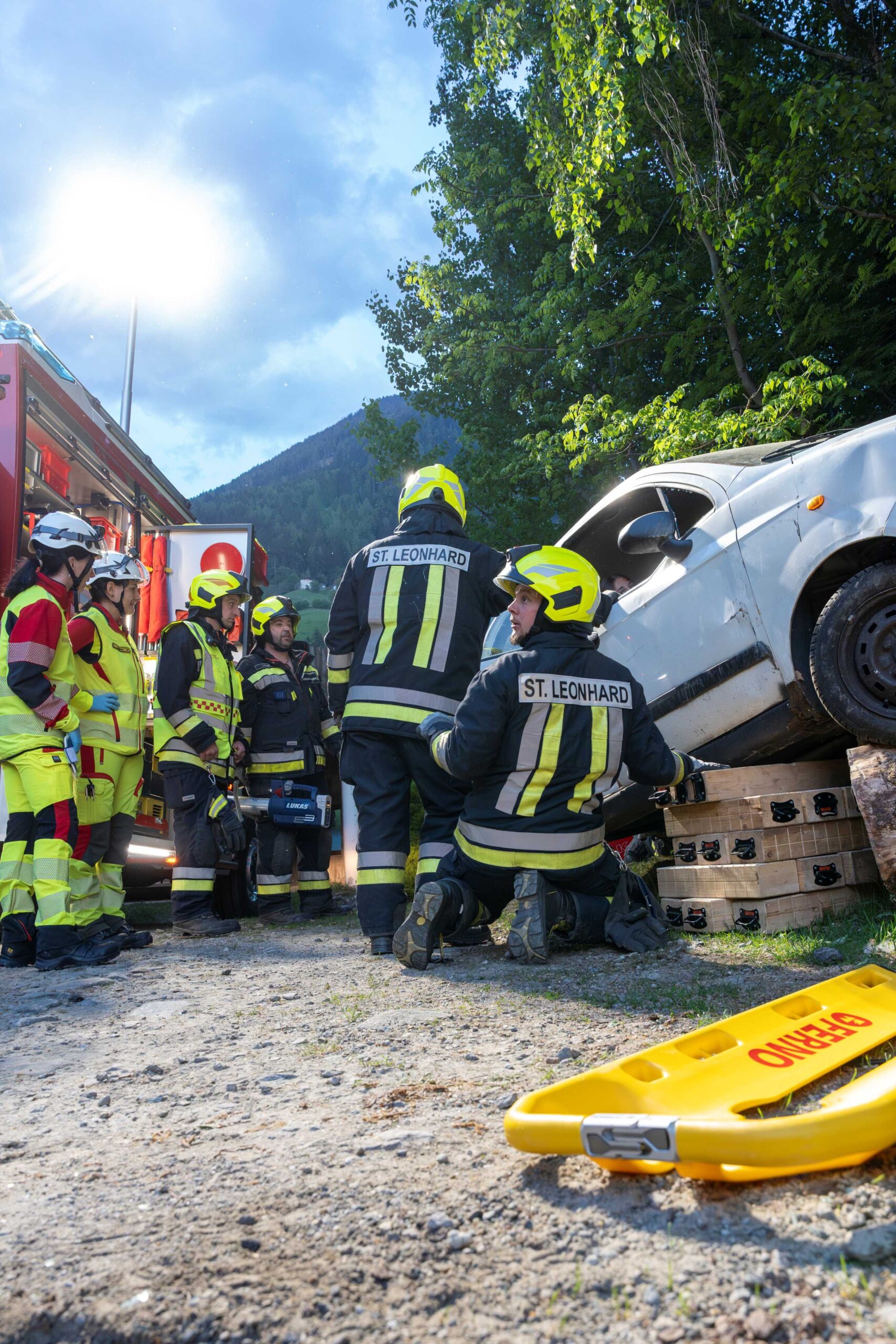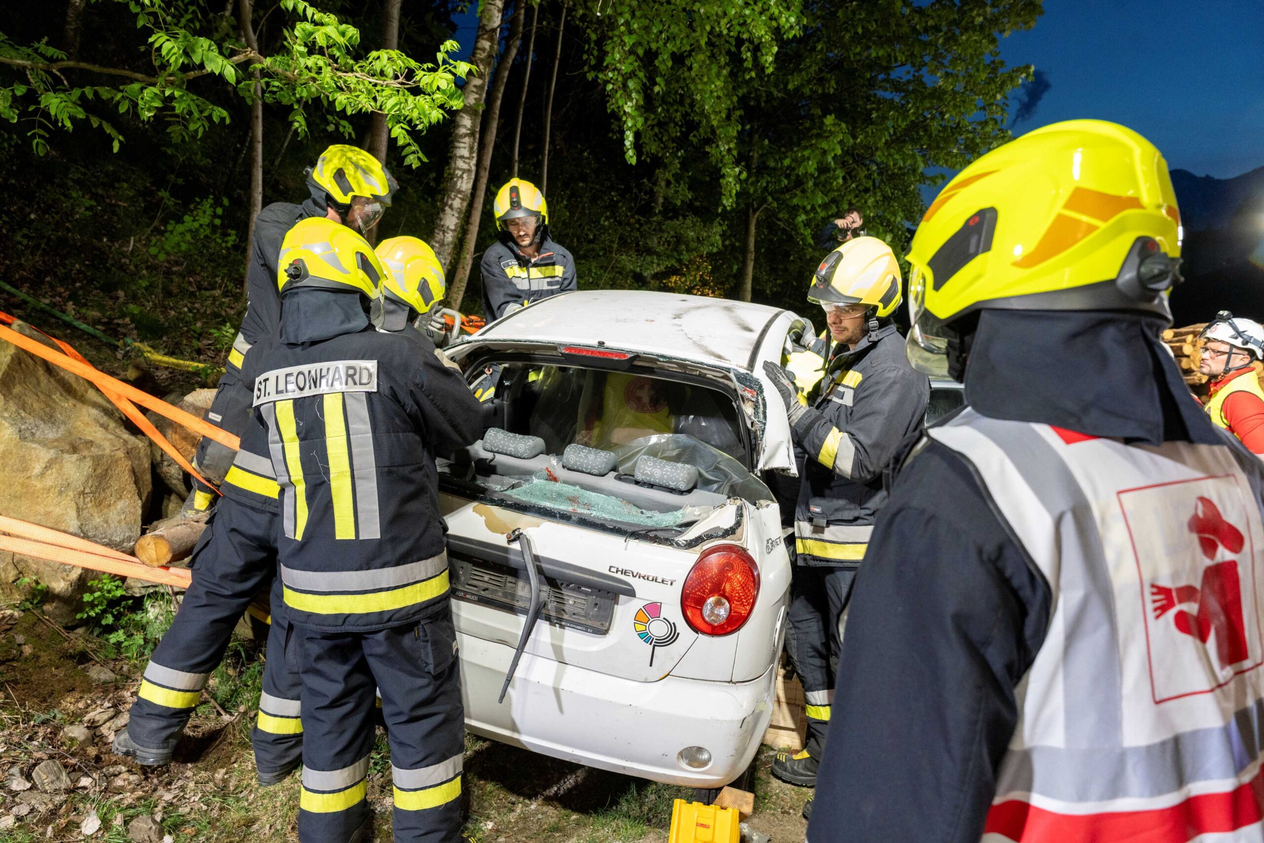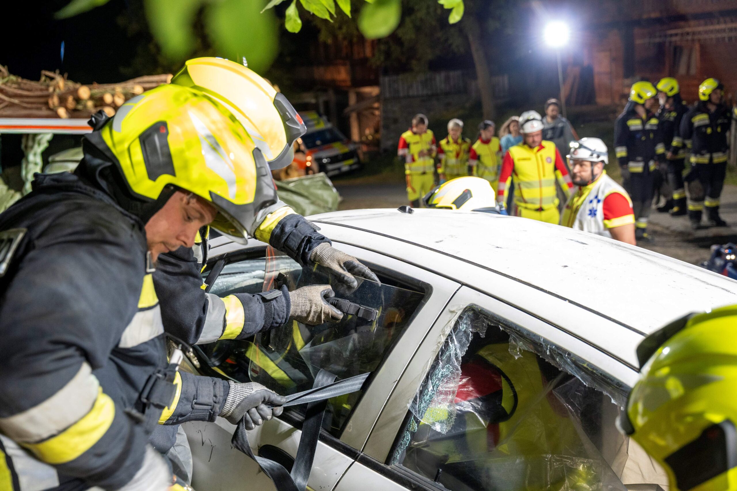 Angenommen wurde ein Verkehrsunfall mit eingeschlossenen und verletzten Personen. Da das Fahrzeug auf einen Baumstamm aufgefahren war und ein weiterer abzurollen drohte, galt es zunächst, das Fahrzeug zu sichern. Nach erfolgter Freigabe nahmen die Helfer*innen des WK-Passeier die Erstversorgung vor. Die Beifahrerin konnte durch die Schaffung einer großen Seitenöffnung schonend geborgen werden.