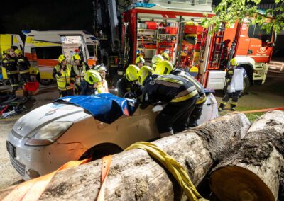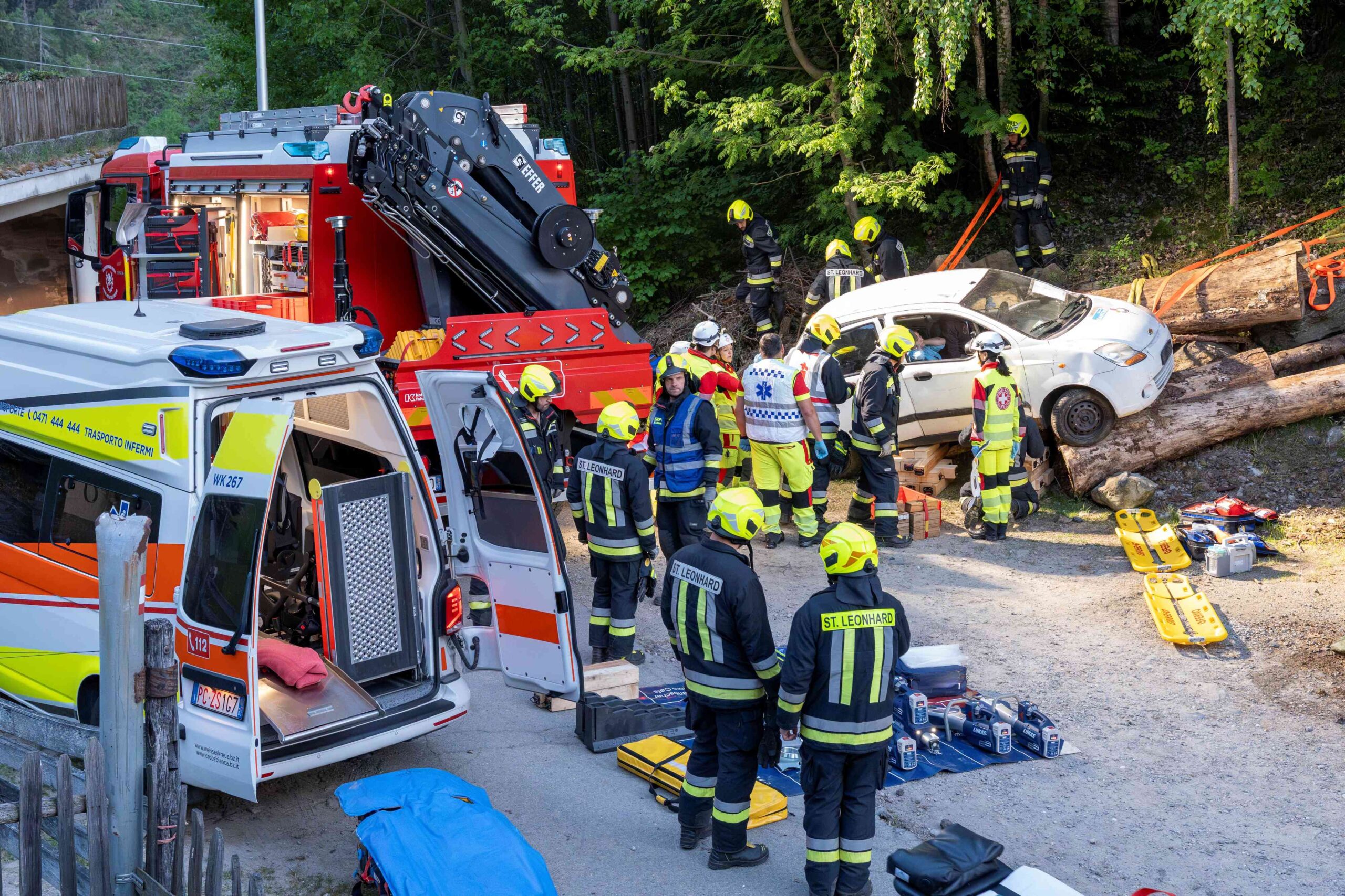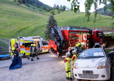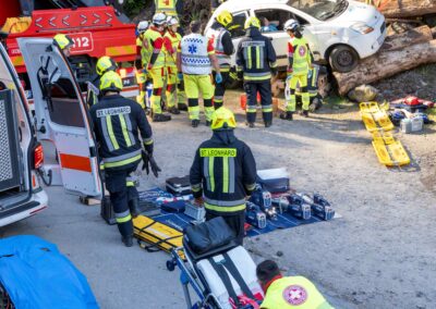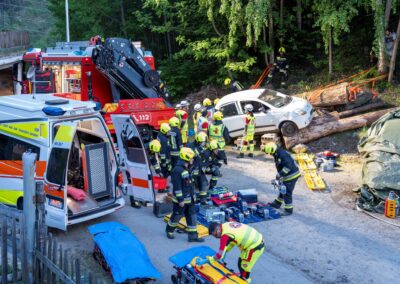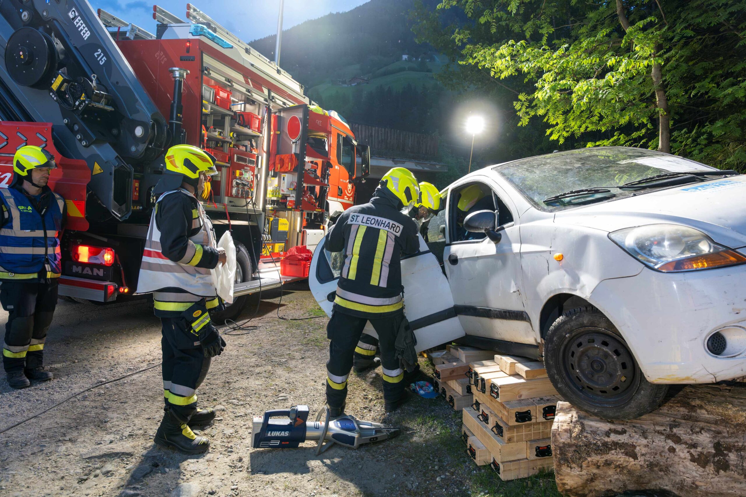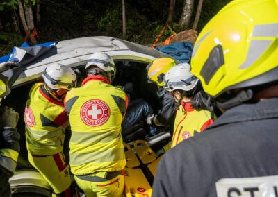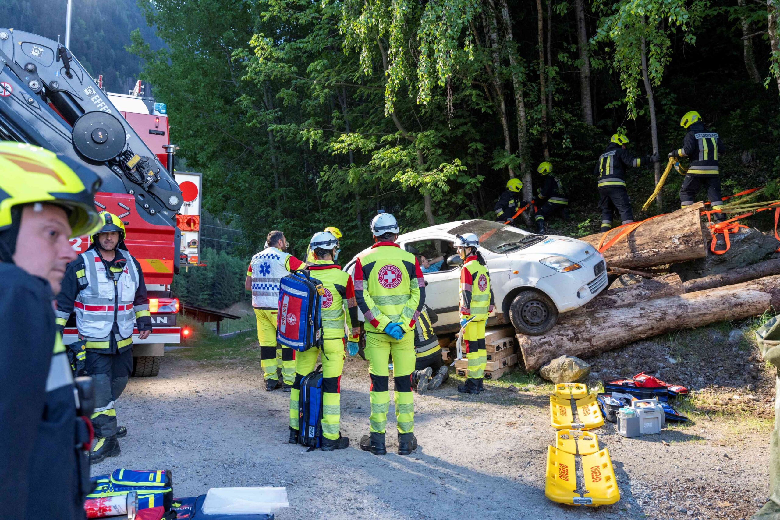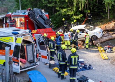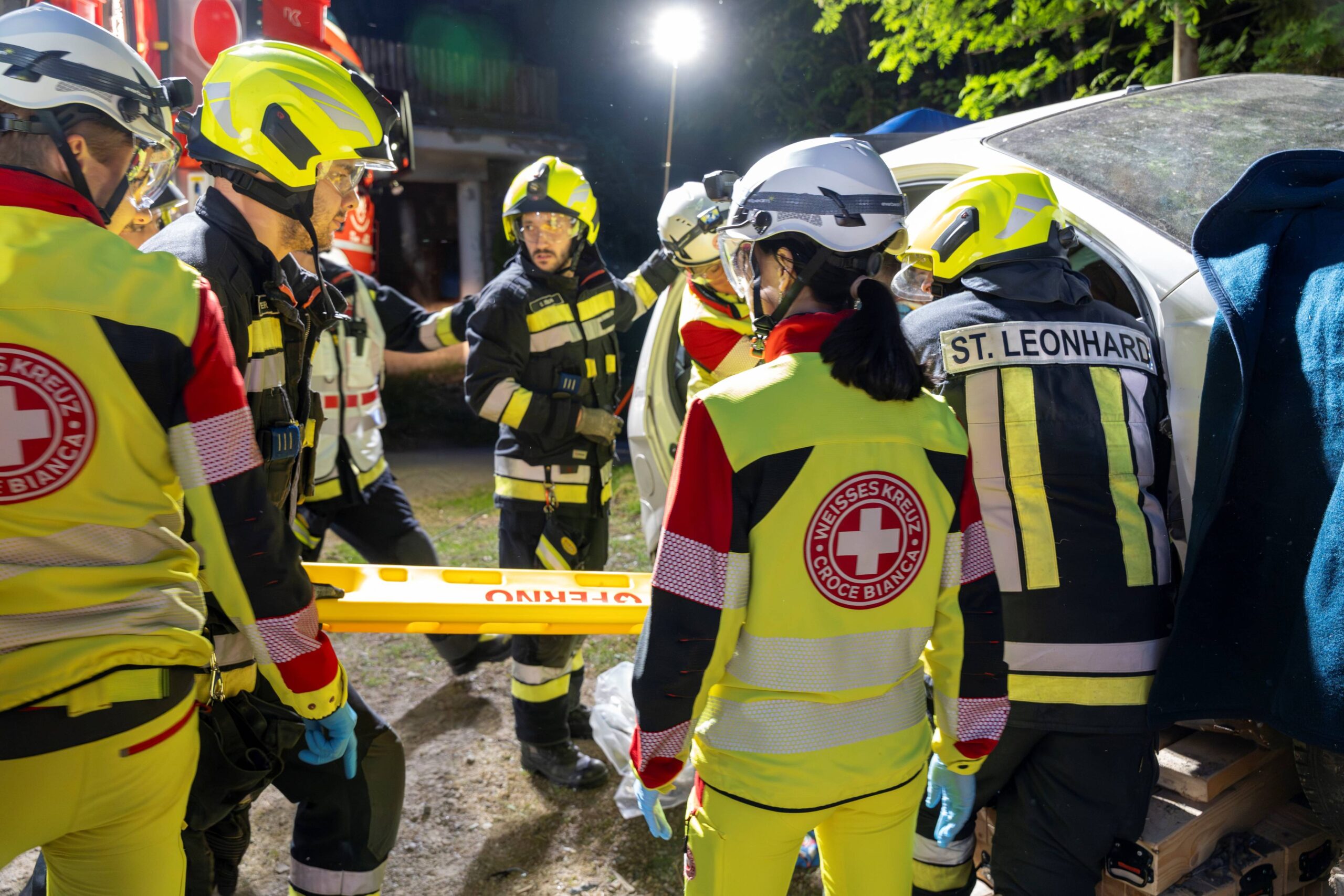 Angenommen wurde ein Verkehrsunfall mit eingeschlossenen und verletzten Personen. Da das Fahrzeug auf einen Baumstamm aufgefahren war und ein weiterer abzurollen drohte, galt es zunächst, das Fahrzeug zu sichern. Nach erfolgter Freigabe nahmen die Helfer*innen des WK-Passeier die Erstversorgung vor. Die Beifahrerin konnte durch die Schaffung einer großen Seitenöffnung schonend geborgen werden.