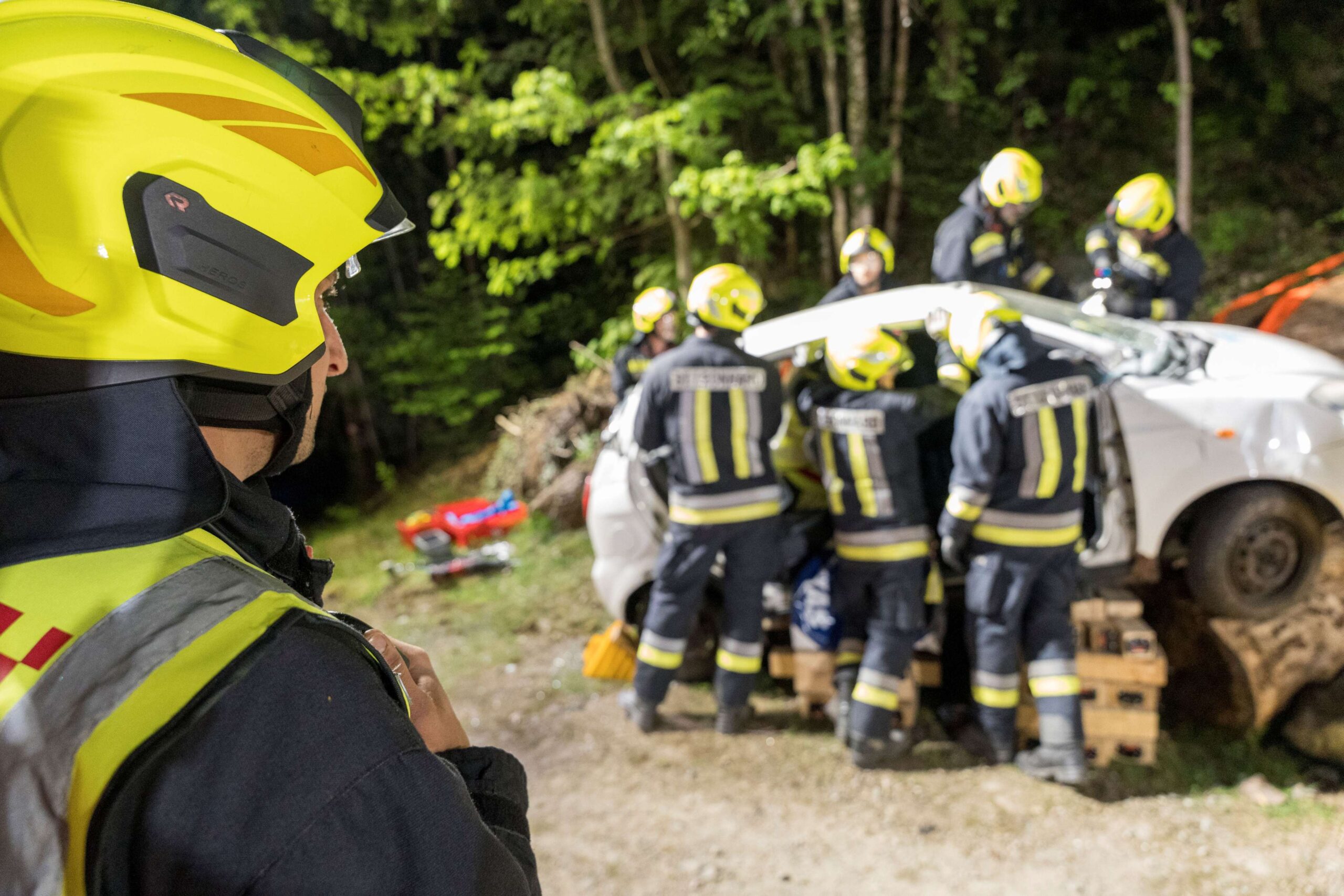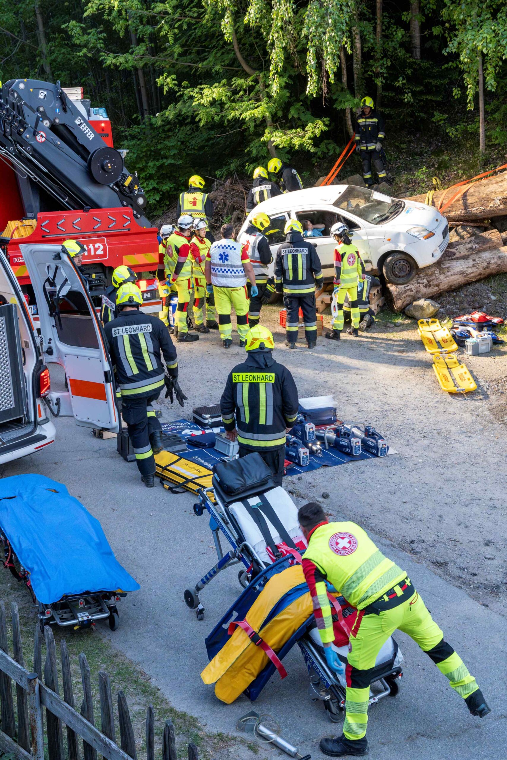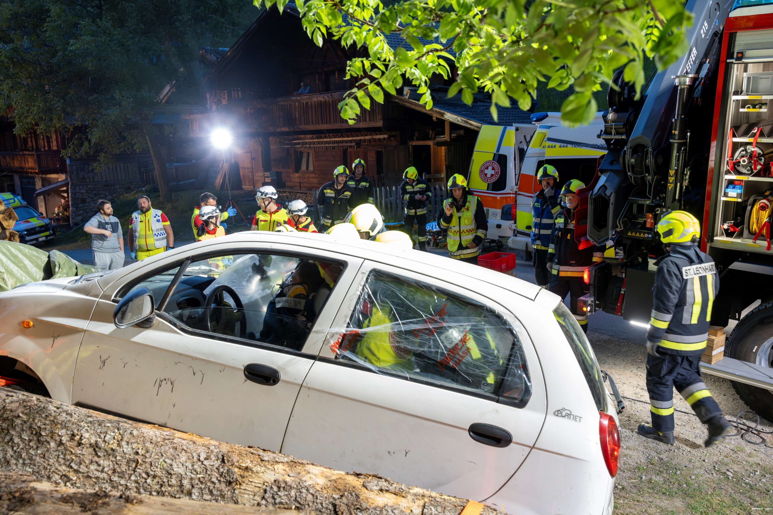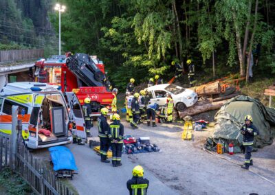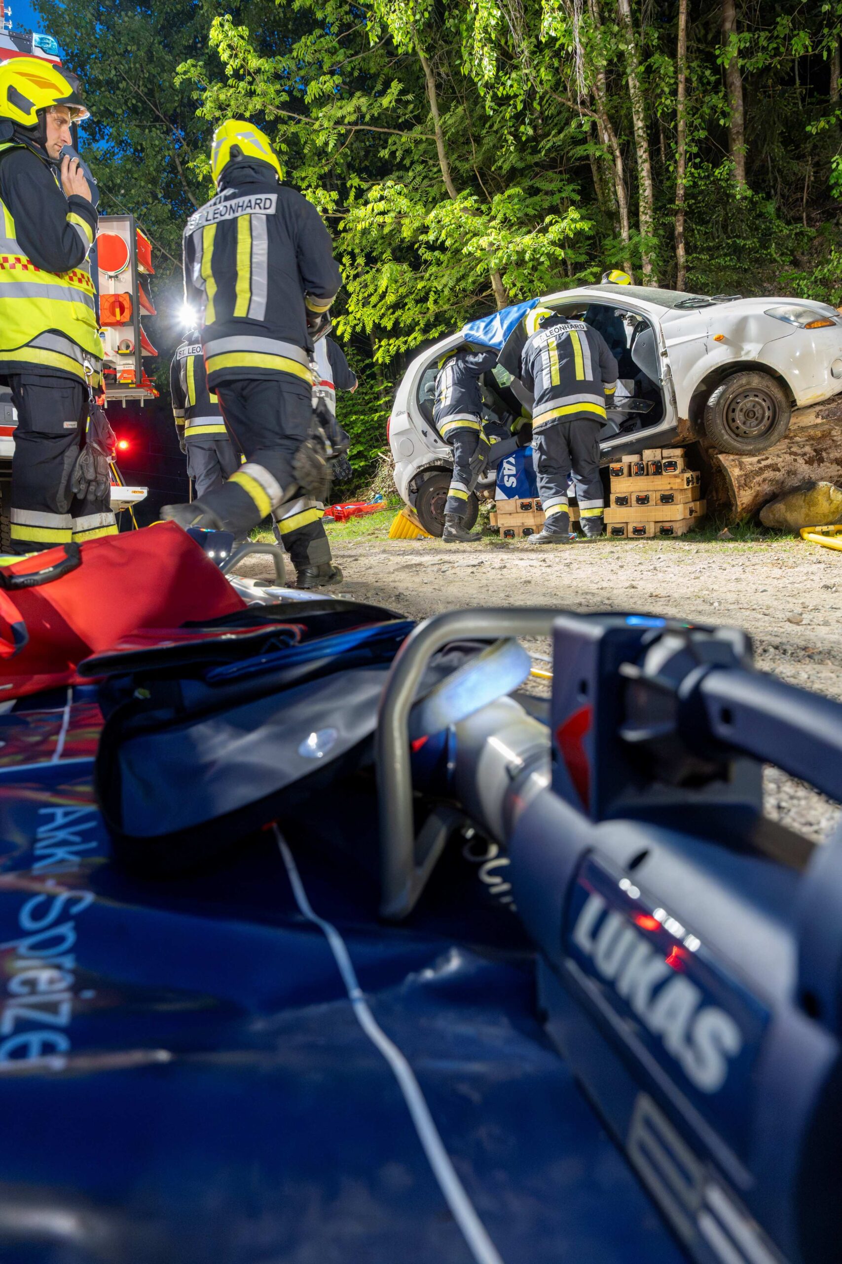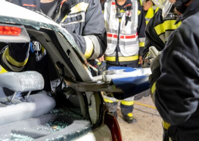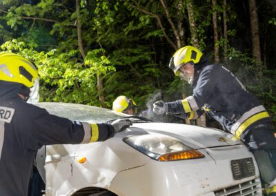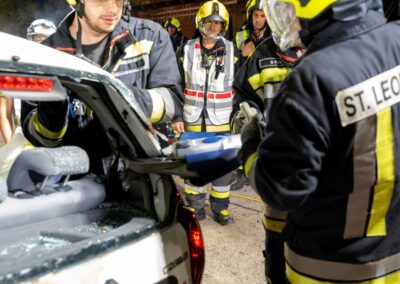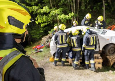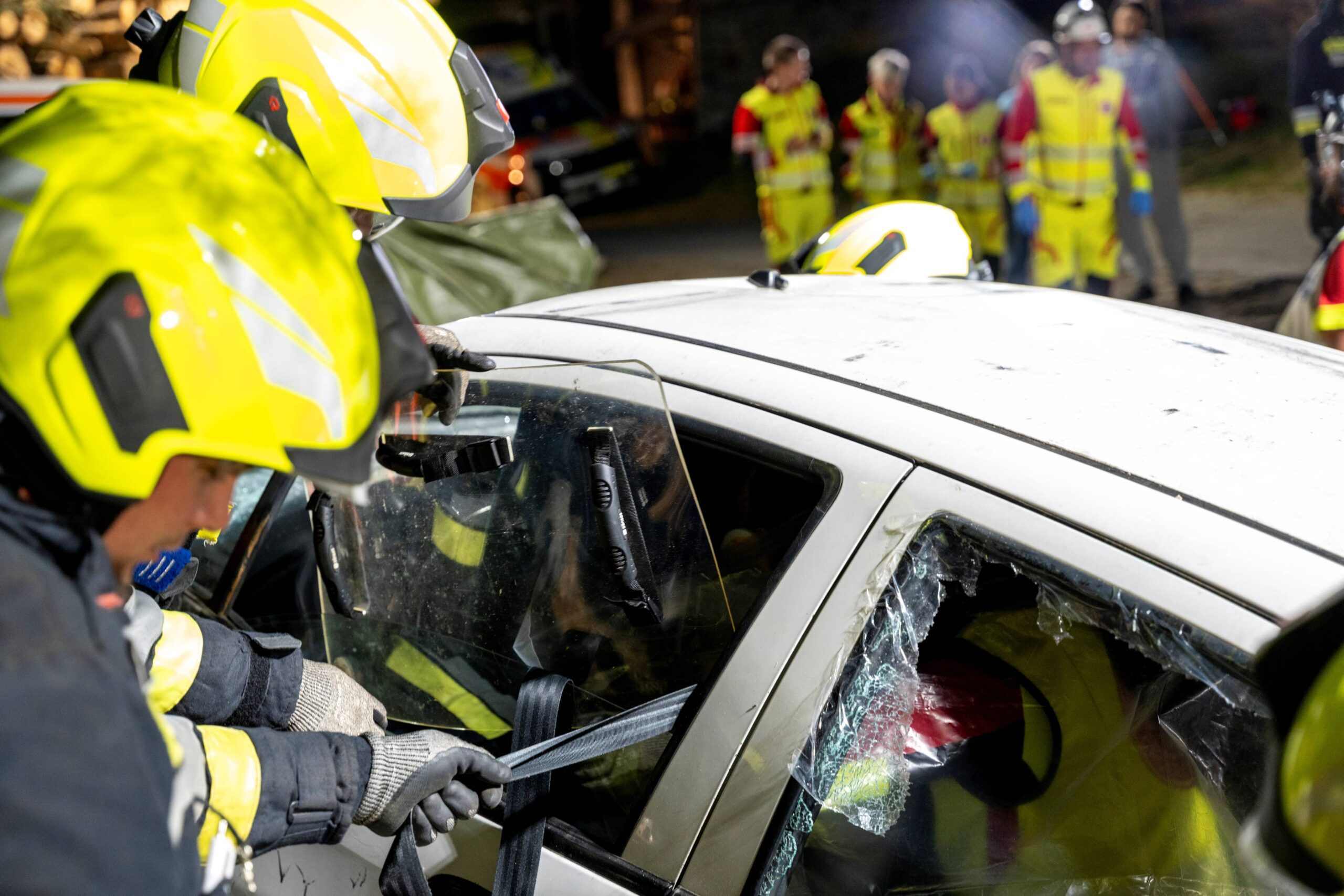 Angenommen wurde ein Verkehrsunfall mit eingeschlossenen und verletzten Personen. Da das Fahrzeug auf einen Baumstamm aufgefahren war und ein weiterer abzurollen drohte, galt es zunächst, das Fahrzeug zu sichern. Nach erfolgter Freigabe nahmen die Helfer*innen des WK-Passeier die Erstversorgung vor. Die Beifahrerin konnte durch die Schaffung einer großen Seitenöffnung schonend geborgen werden.