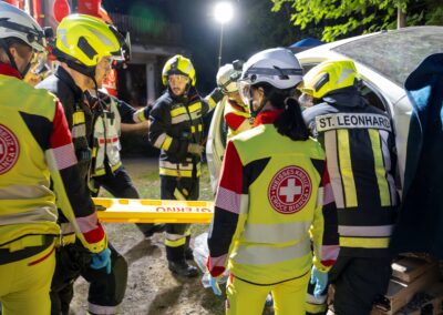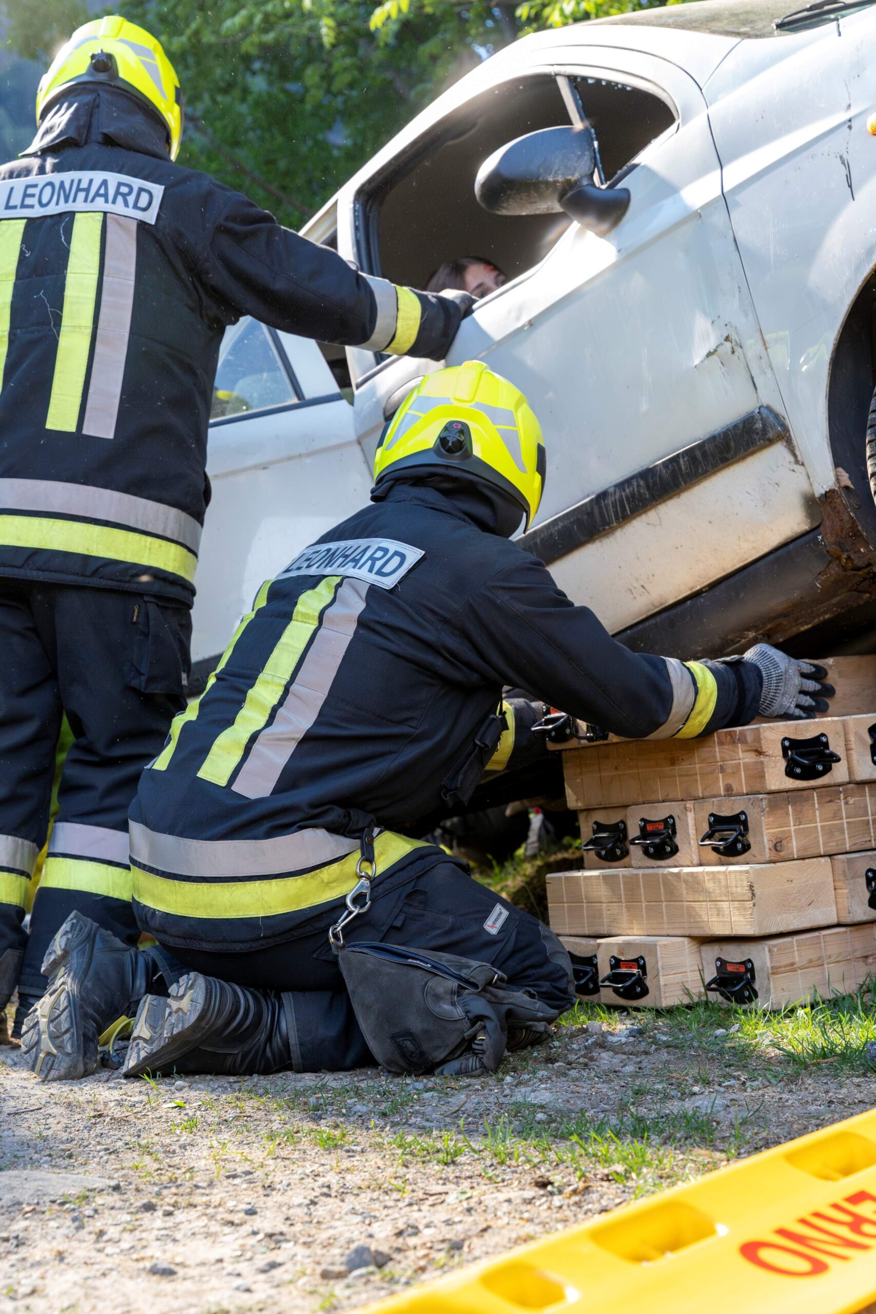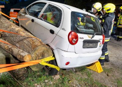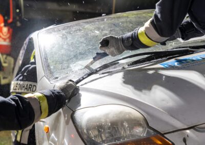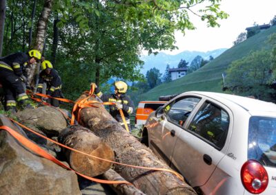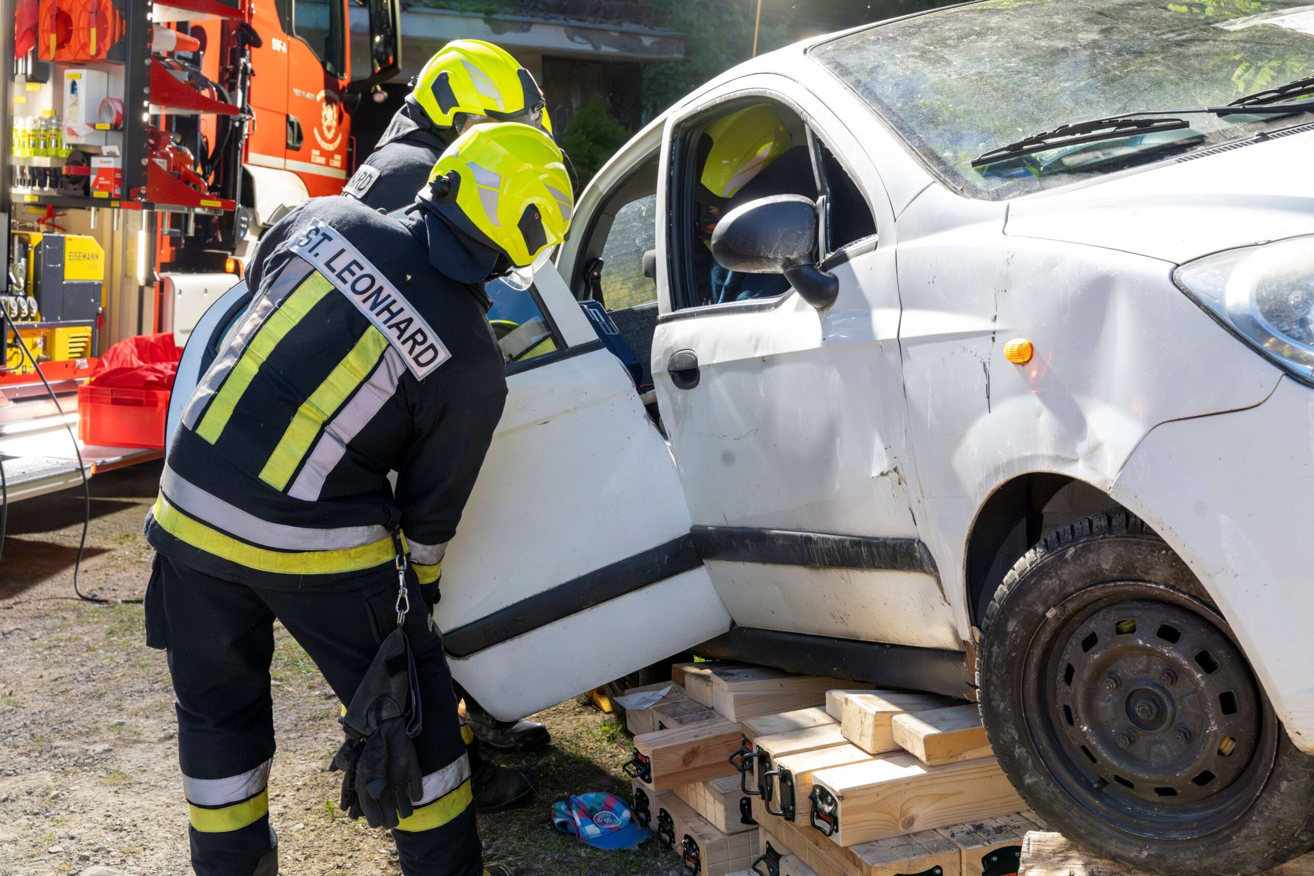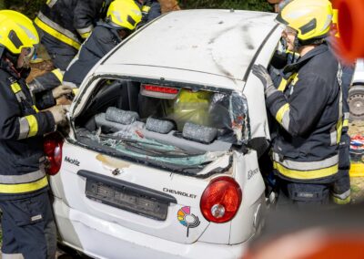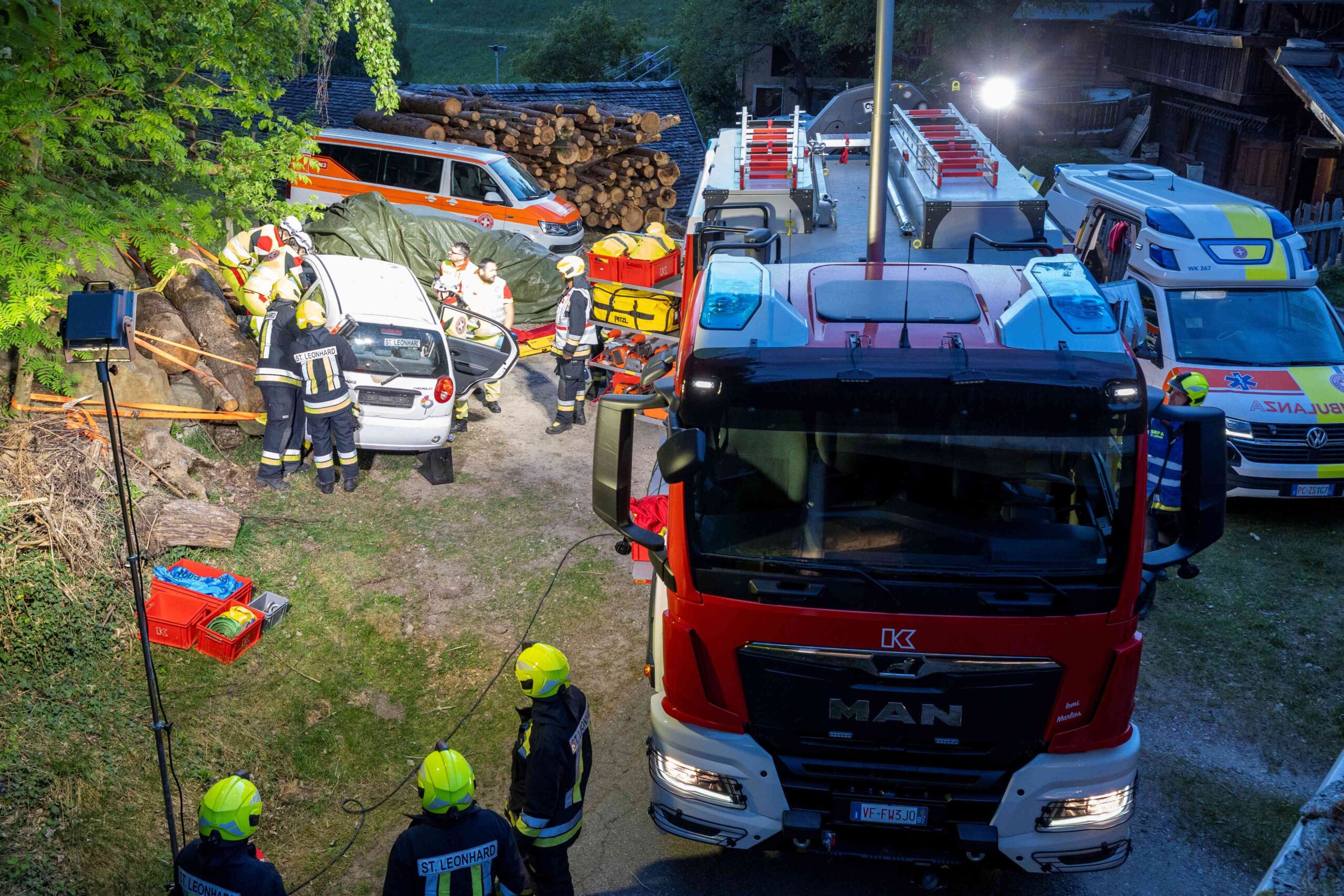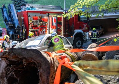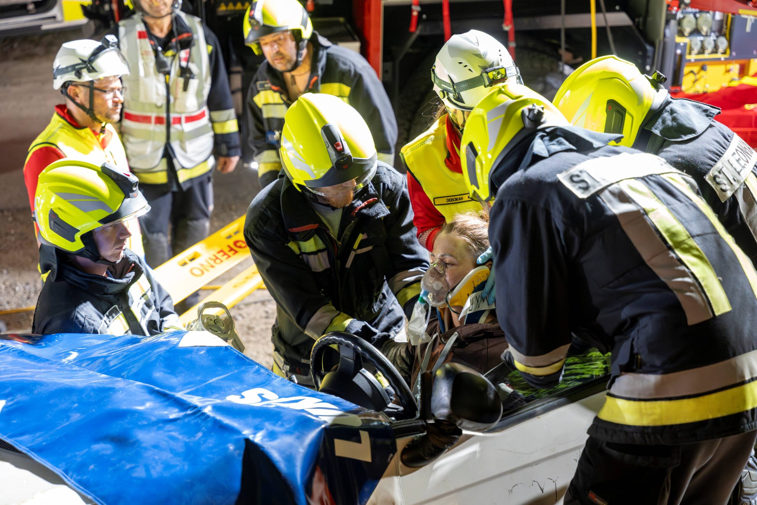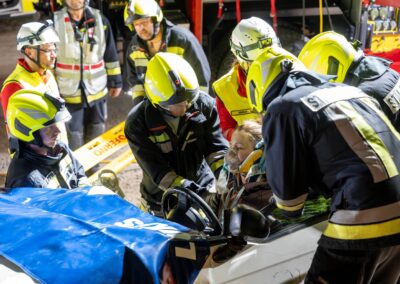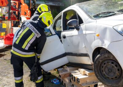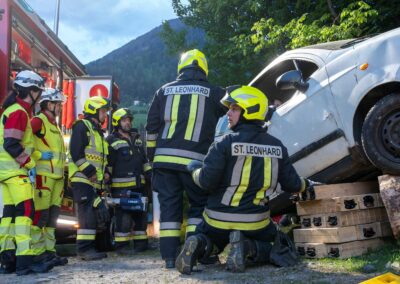 Angenommen wurde ein Verkehrsunfall mit eingeschlossenen und verletzten Personen. Da das Fahrzeug auf einen Baumstamm aufgefahren war und ein weiterer abzurollen drohte, galt es zunächst, das Fahrzeug zu sichern. Nach erfolgter Freigabe nahmen die Helfer*innen des WK-Passeier die Erstversorgung vor. Die Beifahrerin konnte durch die Schaffung einer großen Seitenöffnung schonend geborgen werden.
