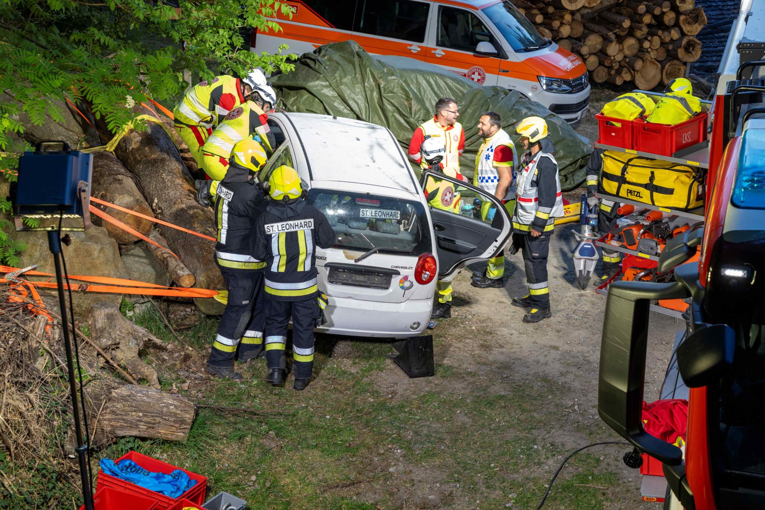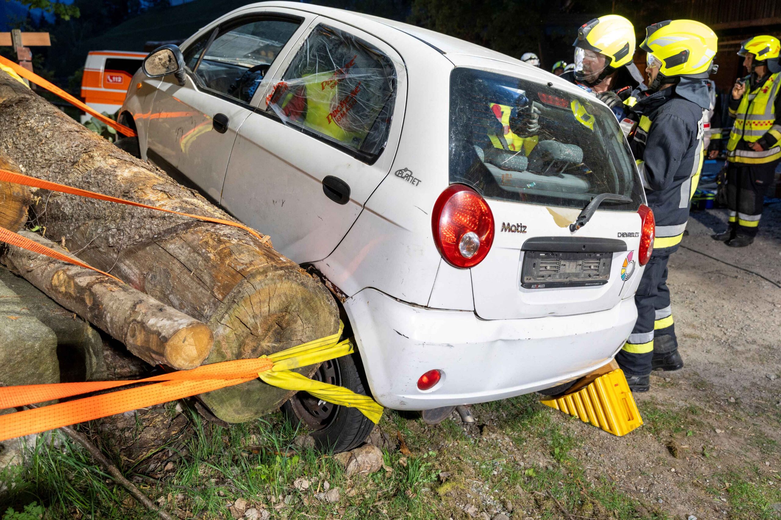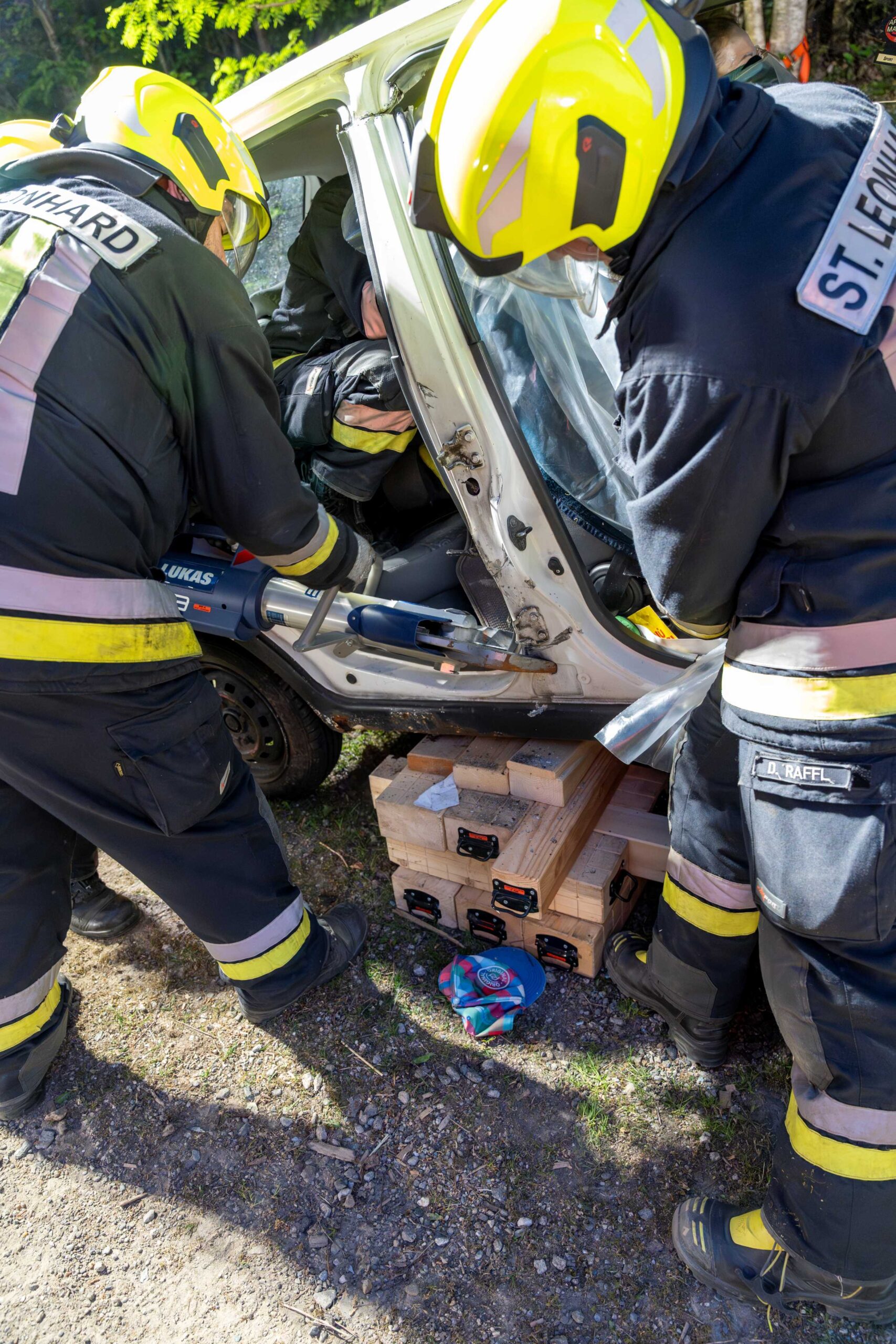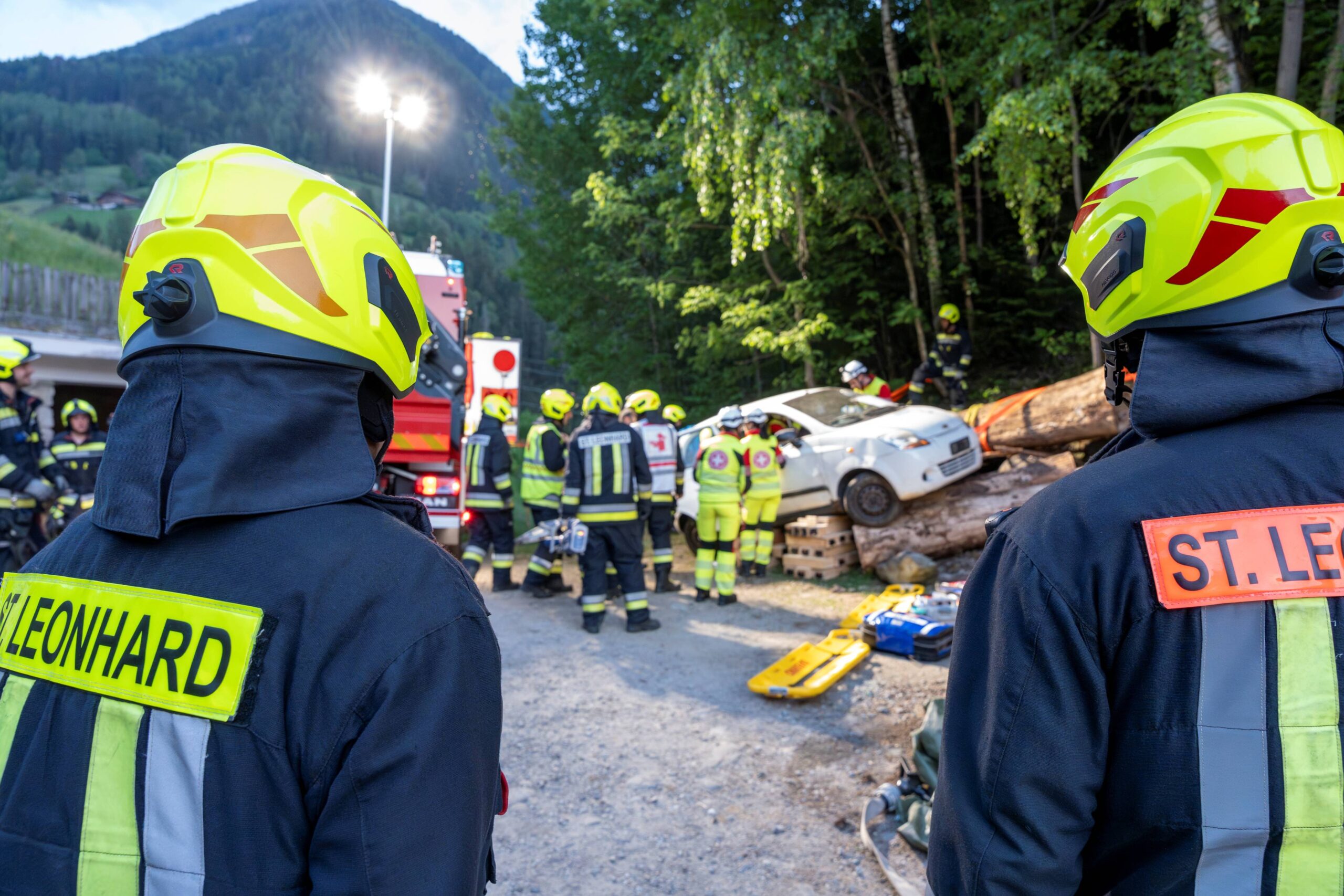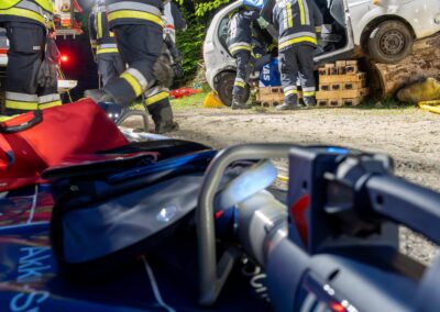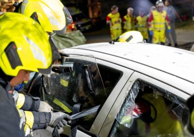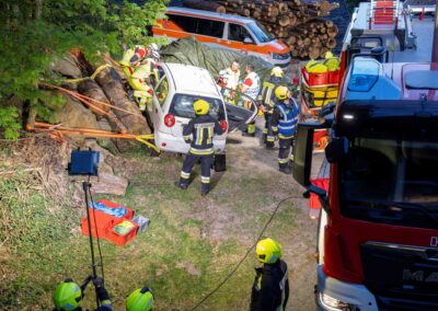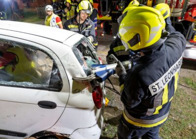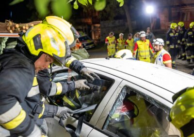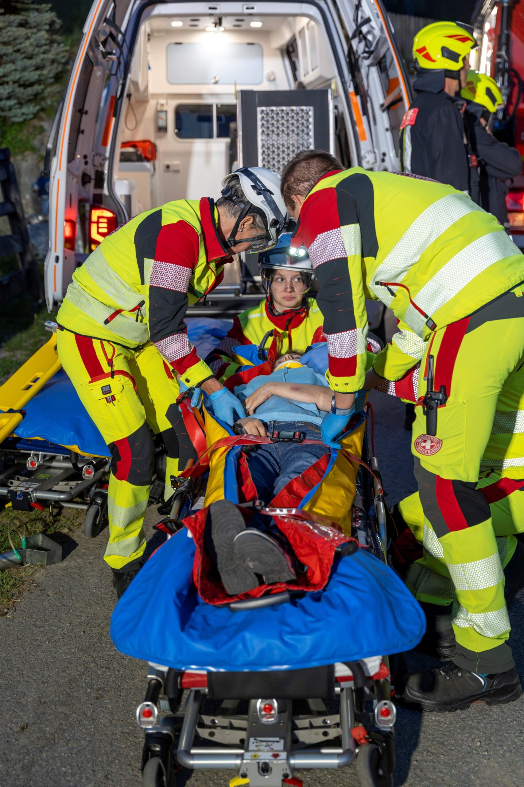 Angenommen wurde ein Verkehrsunfall mit eingeschlossenen und verletzten Personen. Da das Fahrzeug auf einen Baumstamm aufgefahren war und ein weiterer abzurollen drohte, galt es zunächst, das Fahrzeug zu sichern. Nach erfolgter Freigabe nahmen die Helfer*innen des WK-Passeier die Erstversorgung vor. Die Beifahrerin konnte durch die Schaffung einer großen Seitenöffnung schonend geborgen werden.