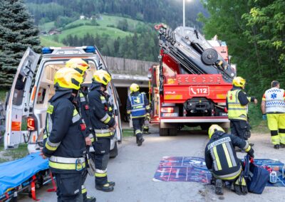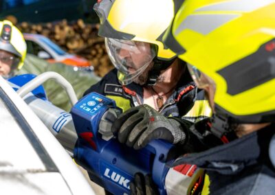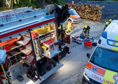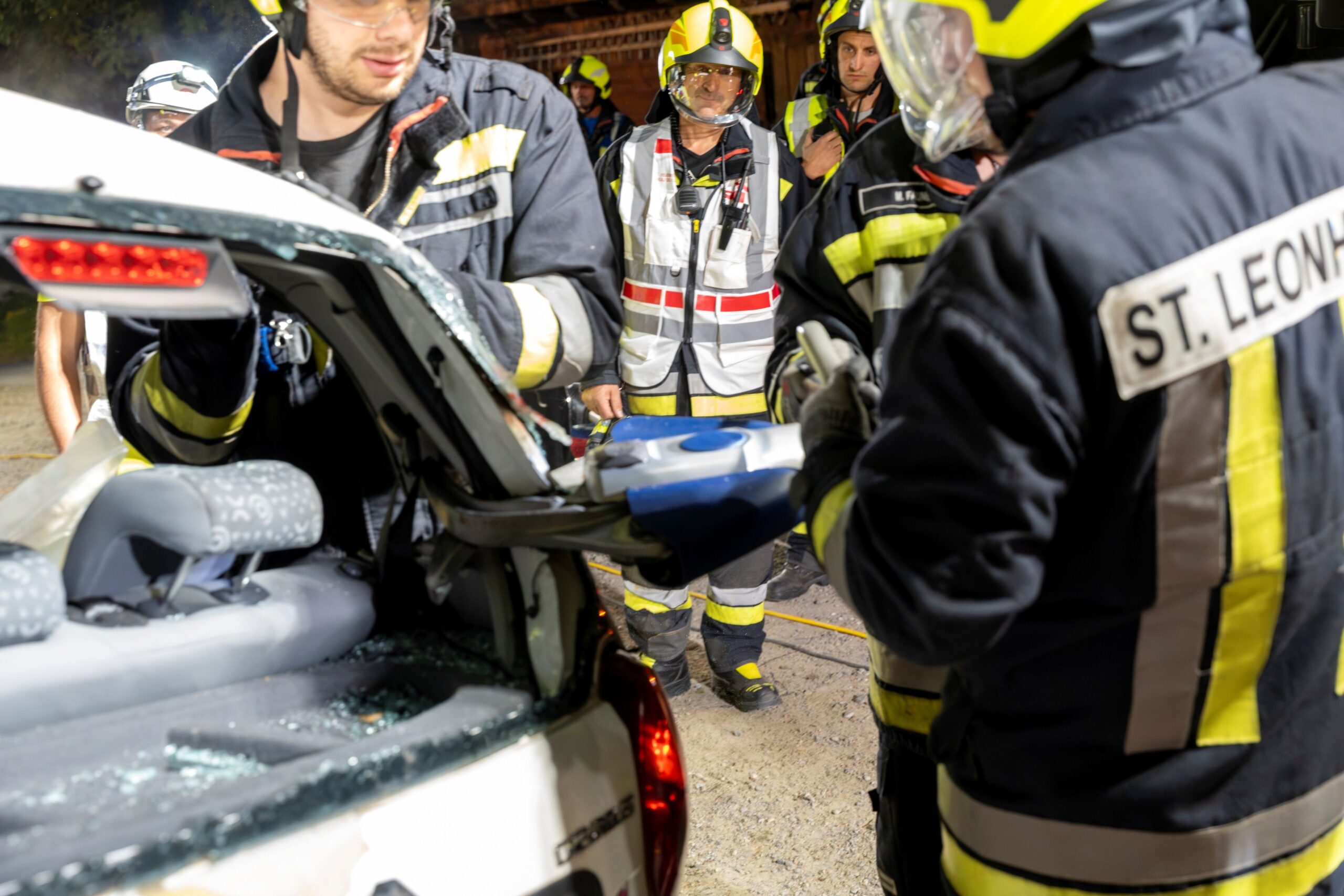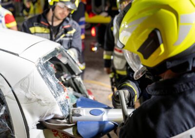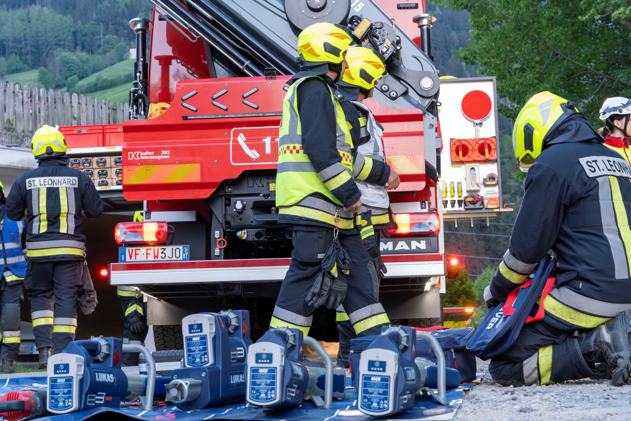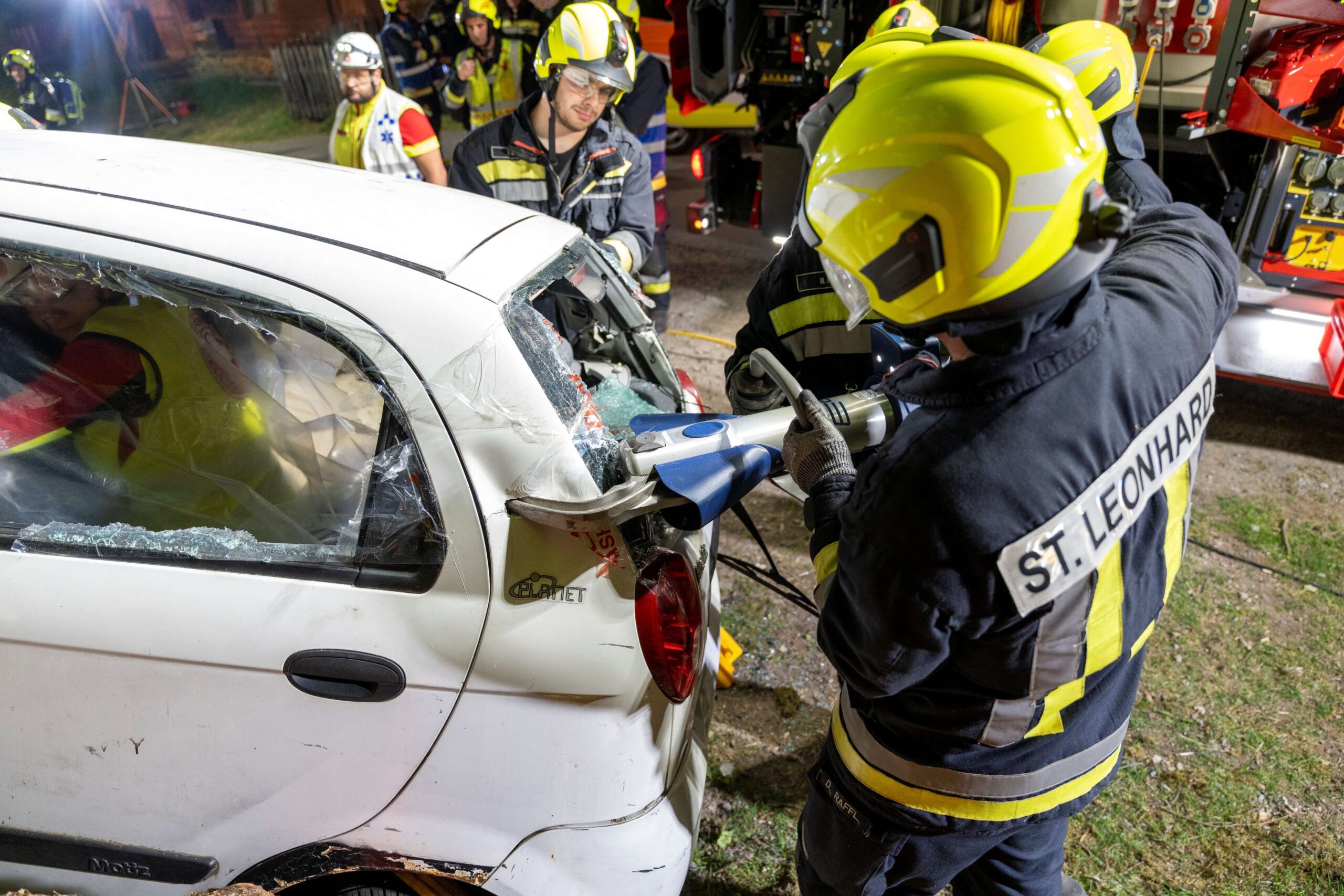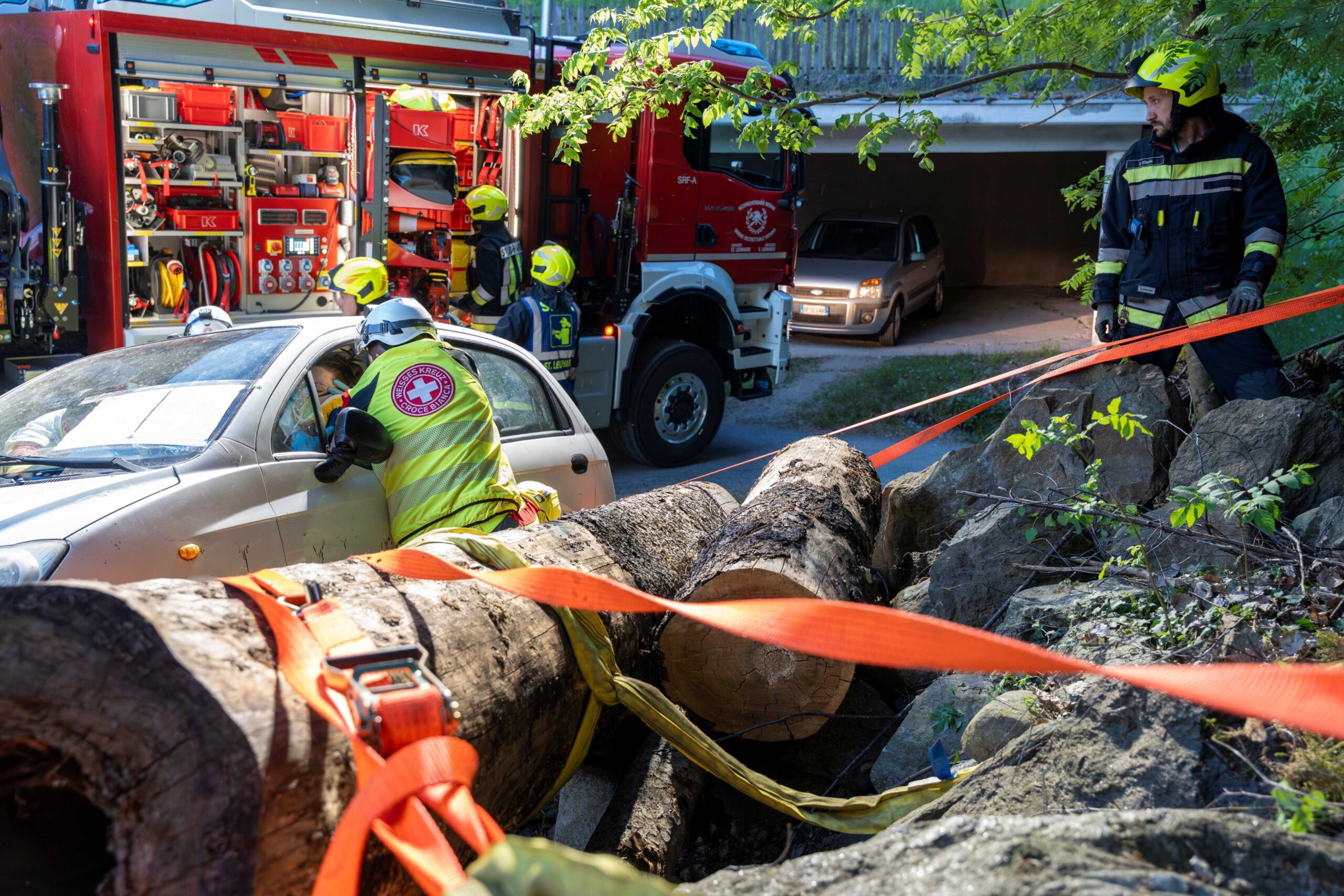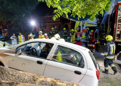 Angenommen wurde ein Verkehrsunfall mit eingeschlossenen und verletzten Personen. Da das Fahrzeug auf einen Baumstamm aufgefahren war und ein weiterer abzurollen drohte, galt es zunächst, das Fahrzeug zu sichern. Nach erfolgter Freigabe nahmen die Helfer*innen des WK-Passeier die Erstversorgung vor. Die Beifahrerin konnte durch die Schaffung einer großen Seitenöffnung schonend geborgen werden.