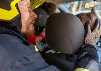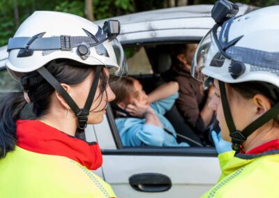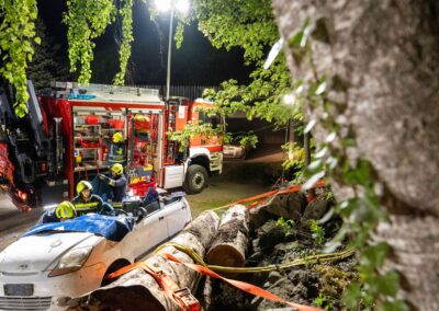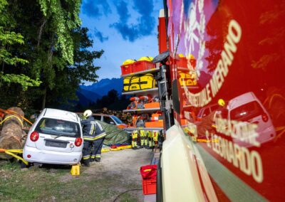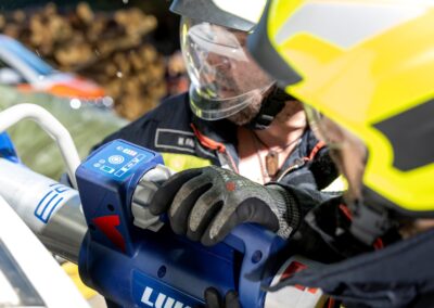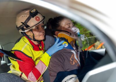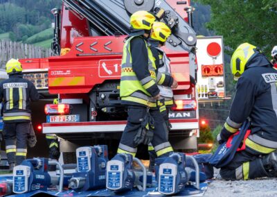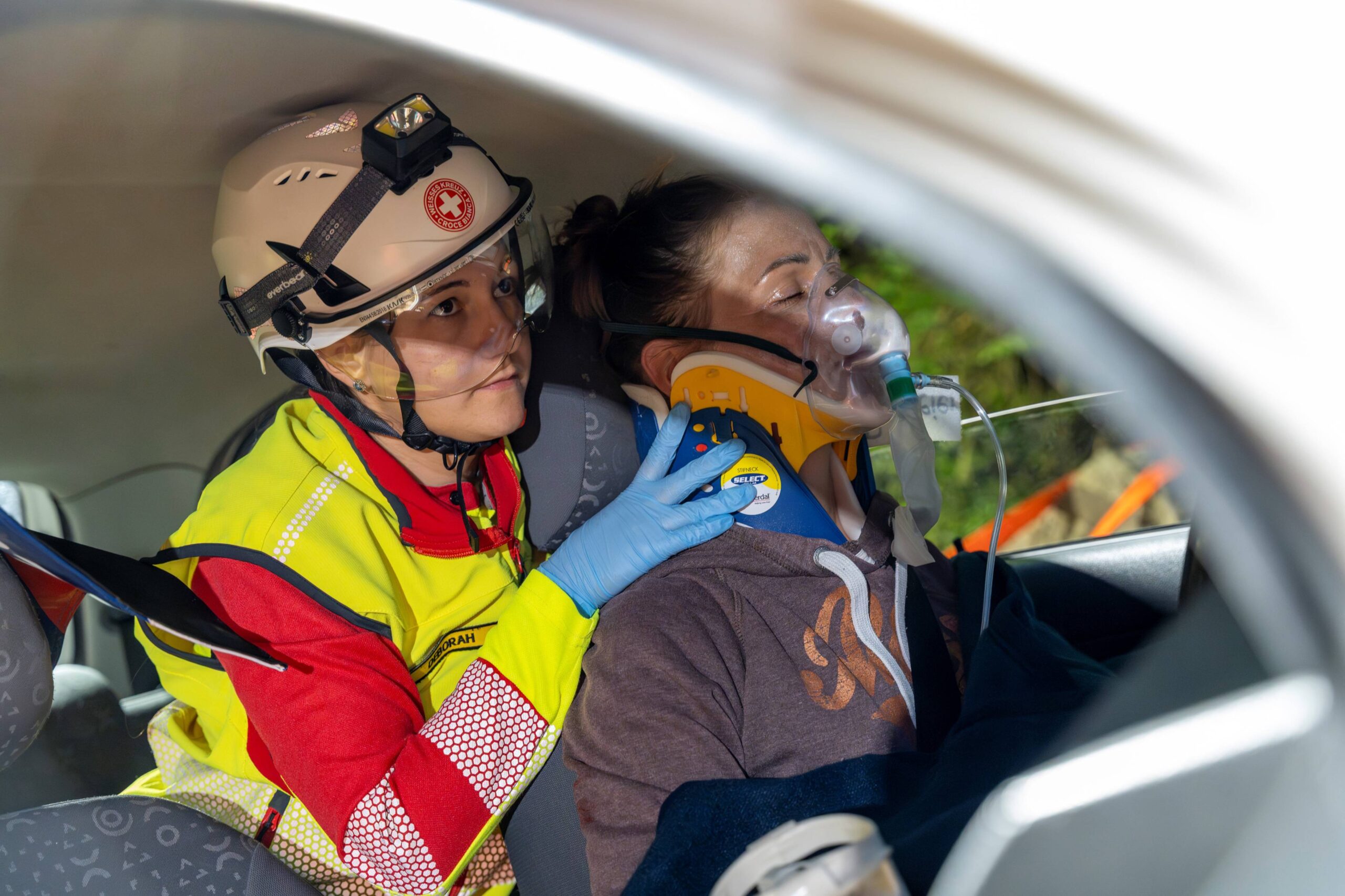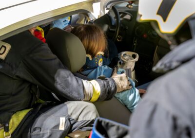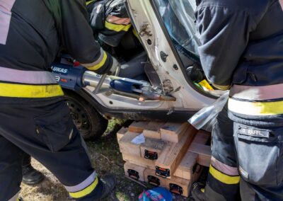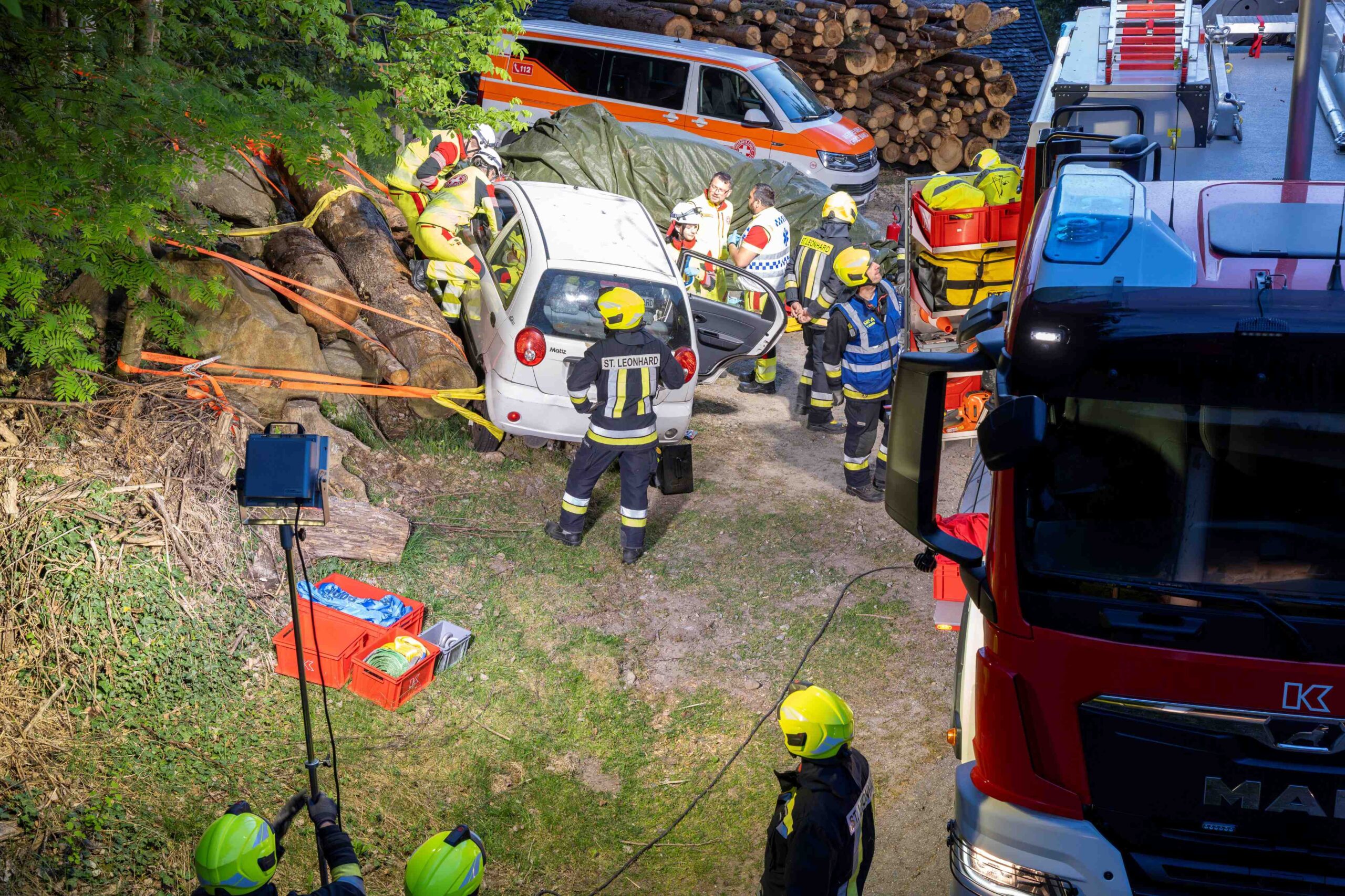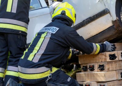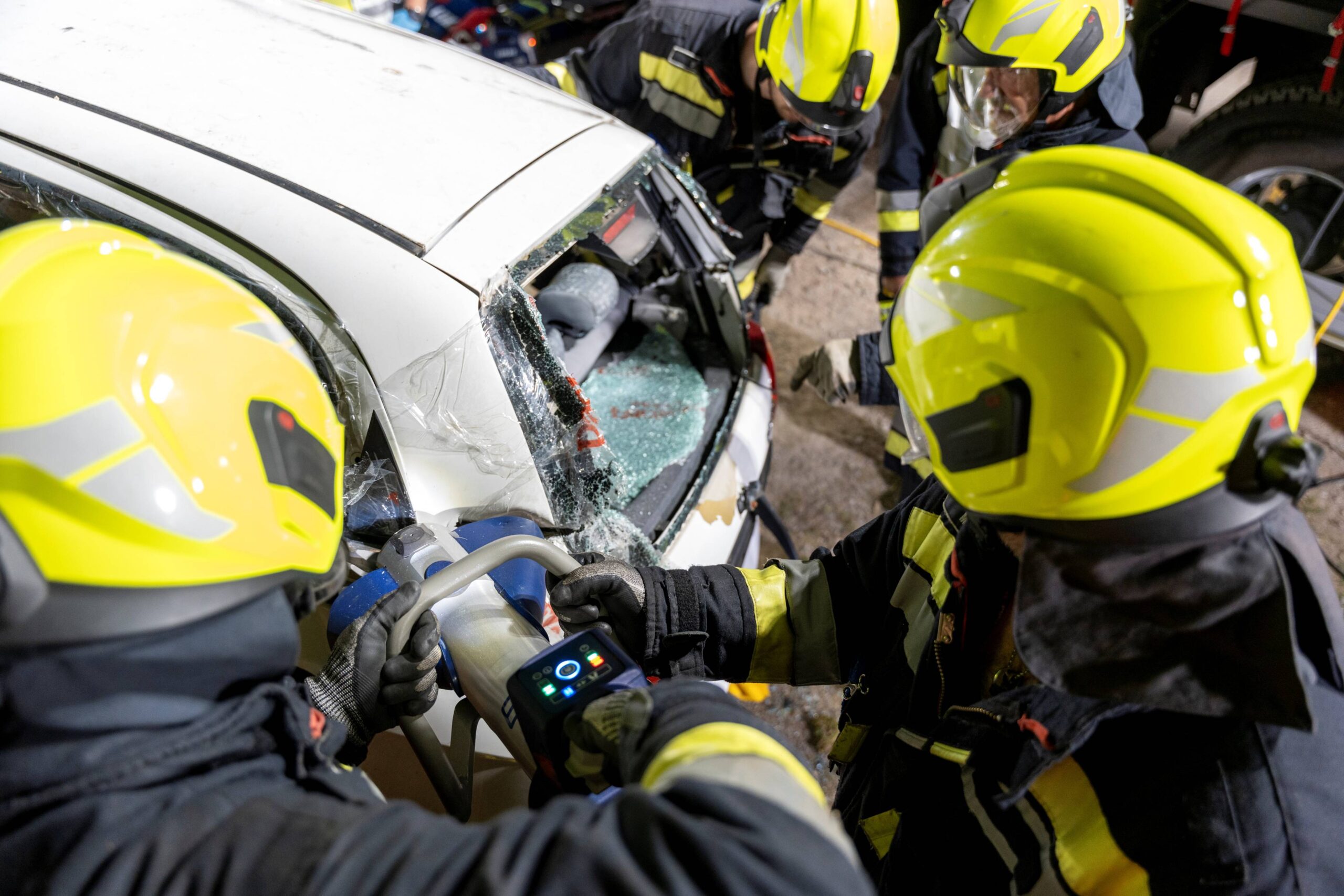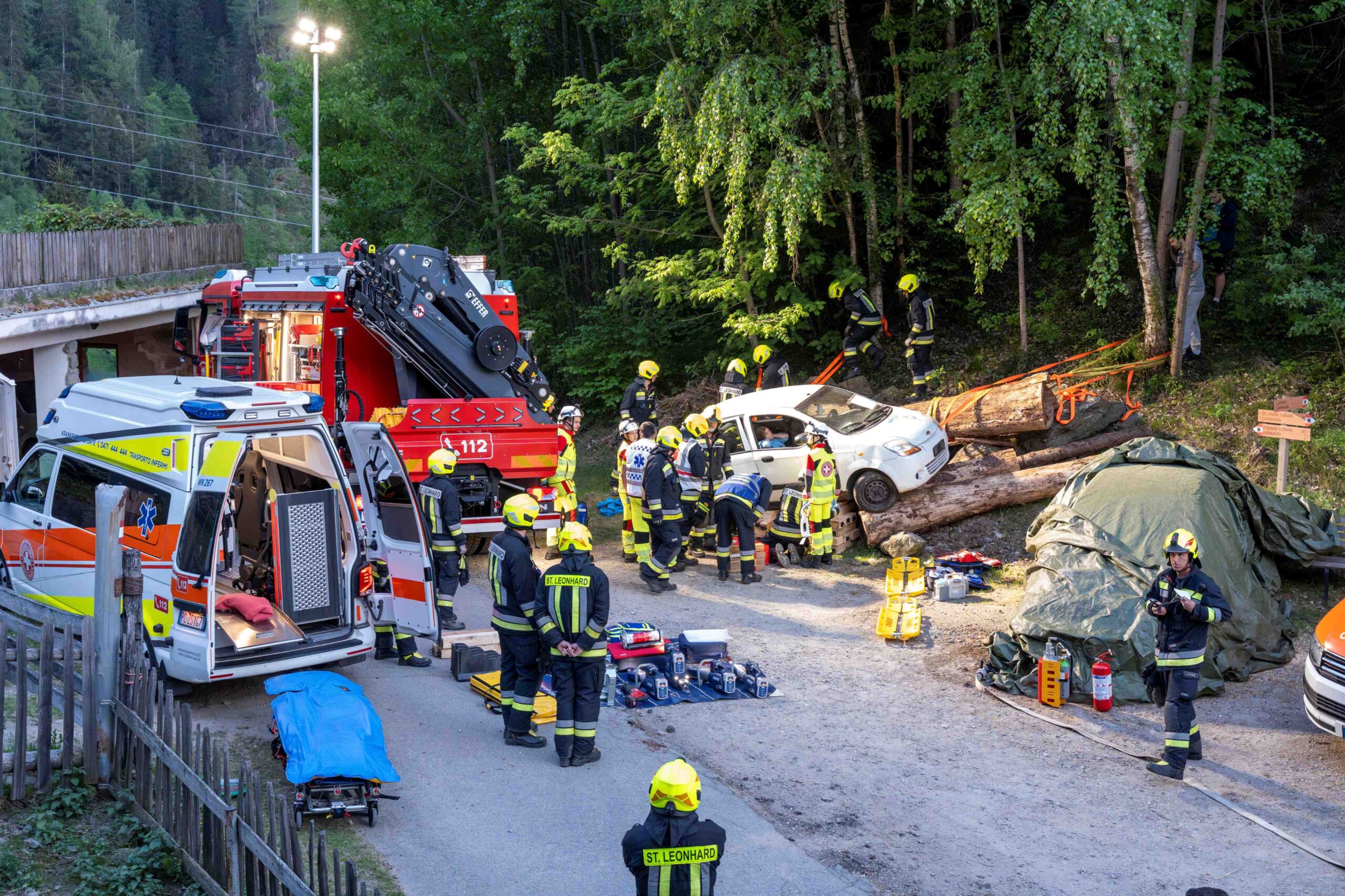 Angenommen wurde ein Verkehrsunfall mit eingeschlossenen und verletzten Personen. Da das Fahrzeug auf einen Baumstamm aufgefahren war und ein weiterer abzurollen drohte, galt es zunächst, das Fahrzeug zu sichern. Nach erfolgter Freigabe nahmen die Helfer*innen des WK-Passeier die Erstversorgung vor. Die Beifahrerin konnte durch die Schaffung einer großen Seitenöffnung schonend geborgen werden.