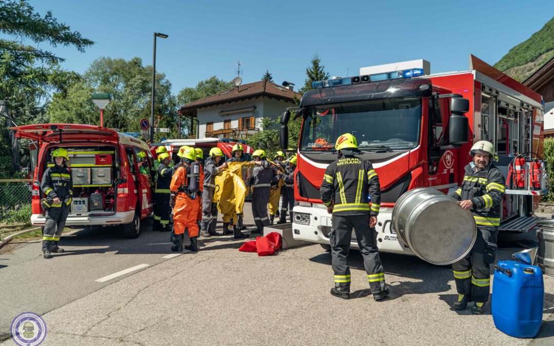 Heute wurden mehrere Wehren des Bezirks Meran zu einem Gefahrguteinsatz nach Gargazon gerufen. In einem Beherbergungsbetrieb war es zu einem Flüssigkeitsaustritt gekommen.