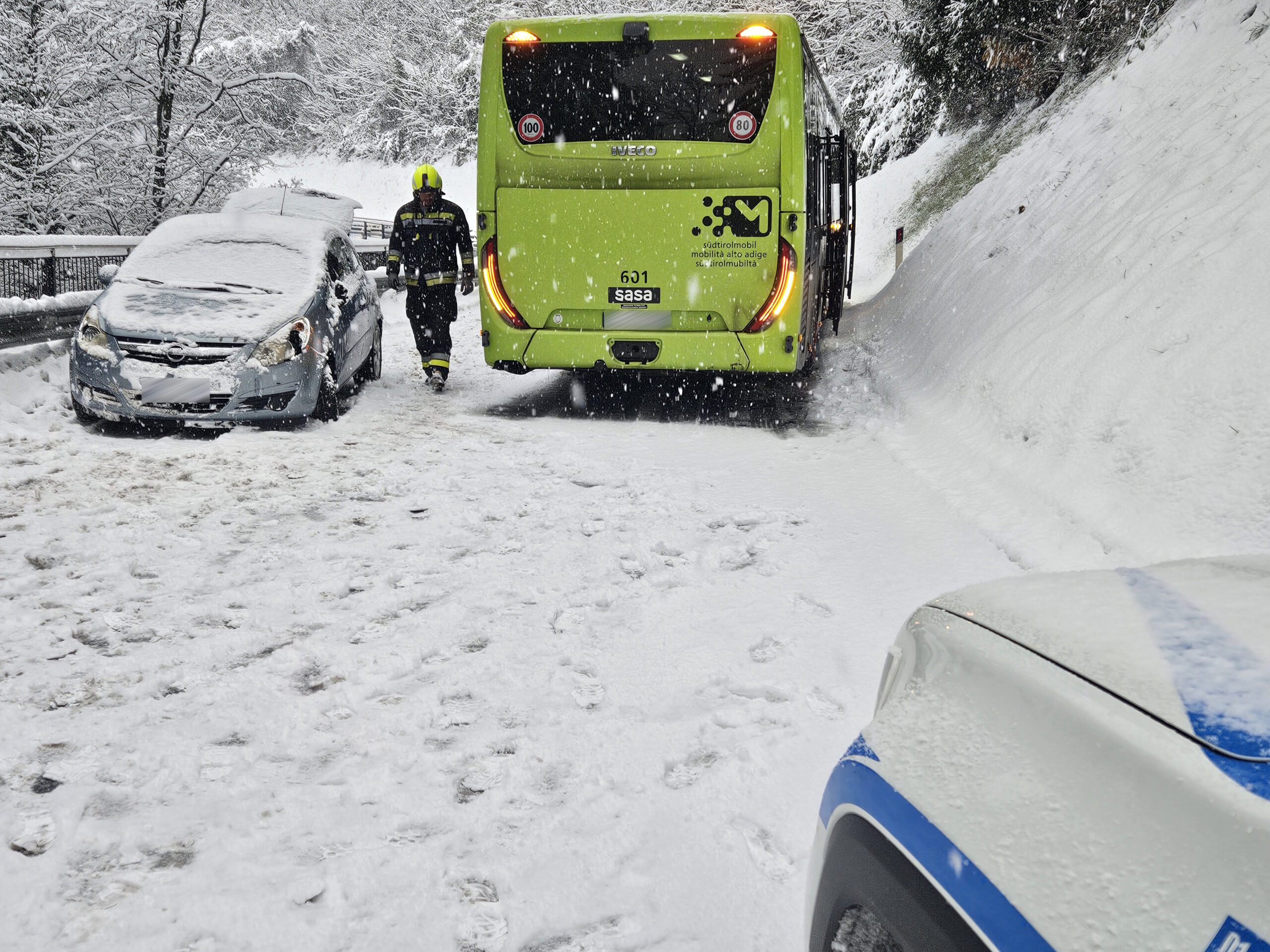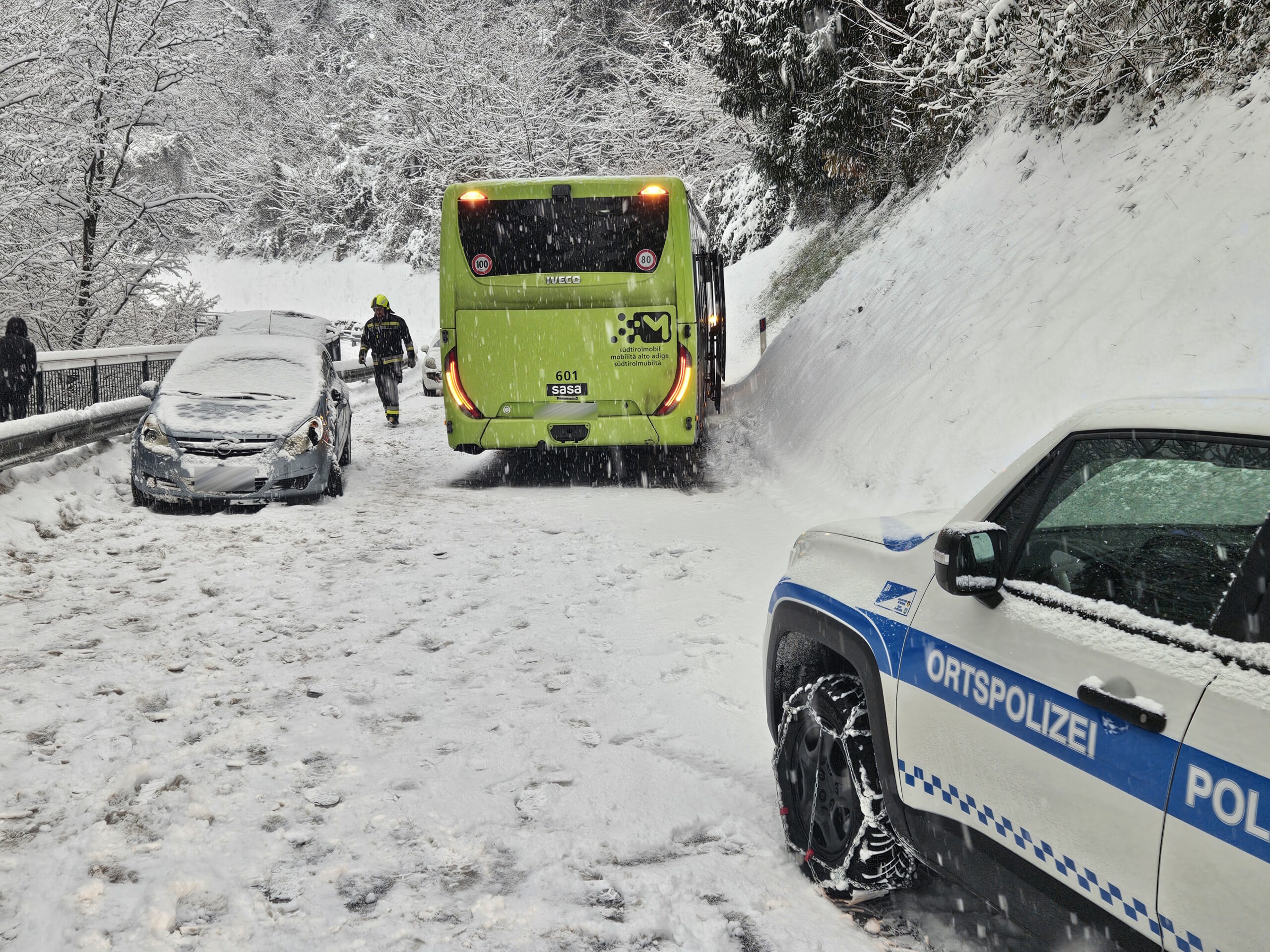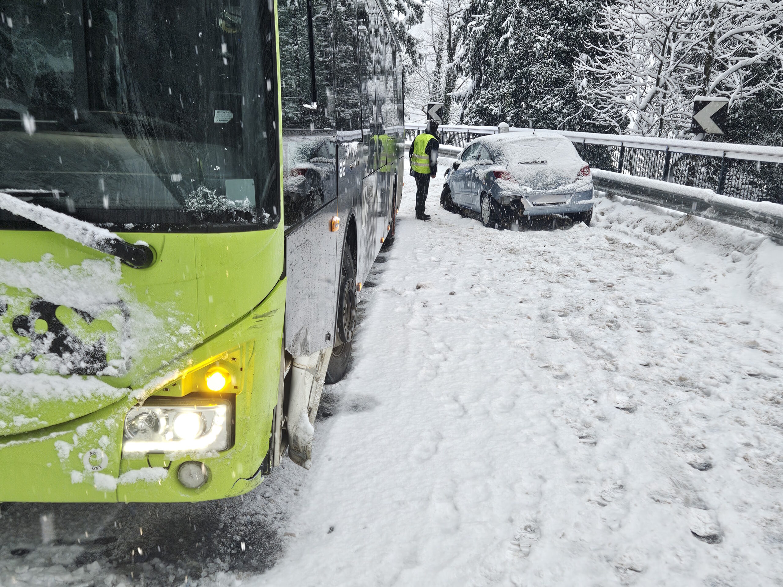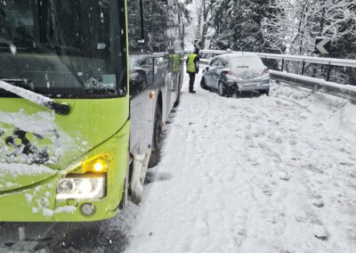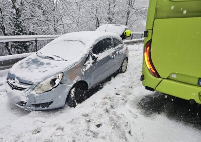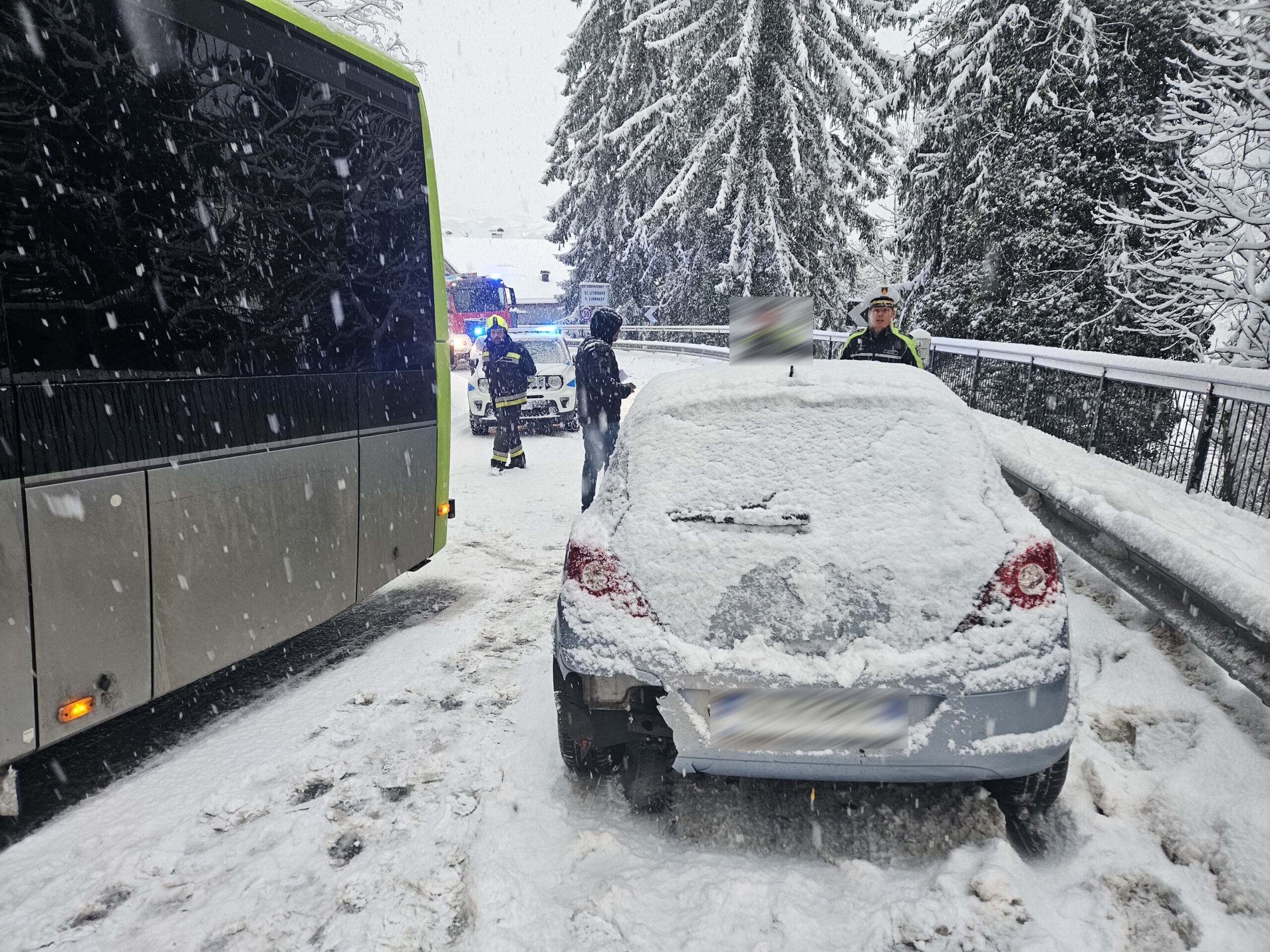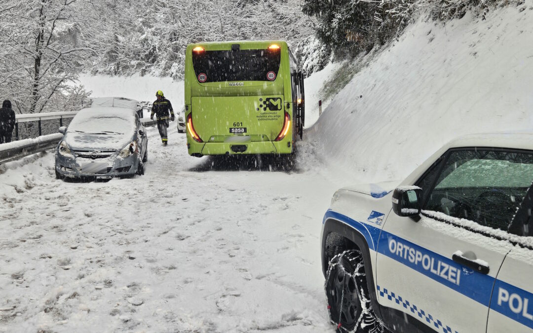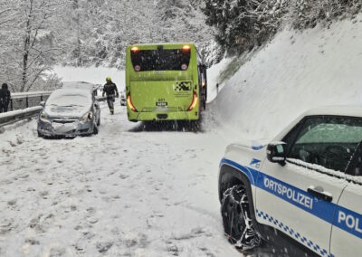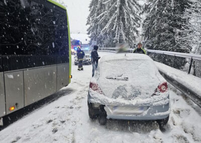 Aufgrund der starken Schneefälle der vergangenen Stunden wurden wir heute Morgen zu einem Einsatz gerufen. Ein PKW war auf einen Linienbus aufgefahren. Unsere Aufgabe bestand darin, die Unfallstelle abzusichern und den Verkehr zu regeln. Mit vereinten Kräften entfernten wir den PKW von der Fahrbahn. Die Unfallerhebung übernahm die Ortspolizei von St. Leonhard.
